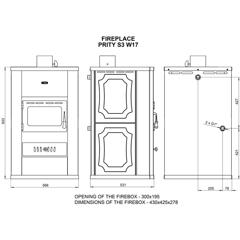 Volumul bazinului de apa este de 23 litri. Soba tip centrala Prity S3W17 poate incalzi 338m³ de aer la o casa izolata sau 244m³ de aer la o casa neizolata.