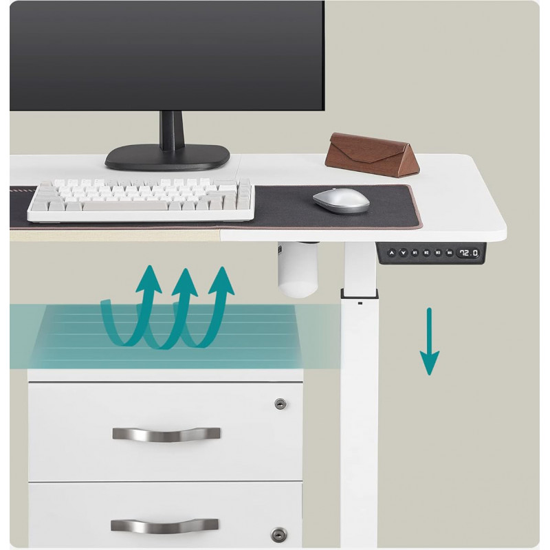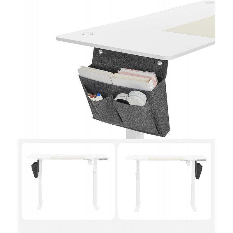 Capacitate de incarcare statica: 80 kg Despre acest articol Puteti regla inaltimea biroului electric intre 72 si 120 cm si puteti stoca 4 inaltimi preferate. Exista, de asemenea, un sistem de protectie la plimbare.Buzunar textil pe partea stanga sau dreapta pentru carti, reviste si multe altele, 3 carlige pentru casti si genti, 2 prize pentru o buna gestionare a cablurilor. Nimic nu va favorizeaza mai mult concentrarea decat un birou ordonat!Placa imbinata in alb de baza si bej confera acestui suport de birou mai mult stil, iar textura asemanatoare tesaturii din zona bej a blatului ofera o senzatie de confort. Piesele marcate si