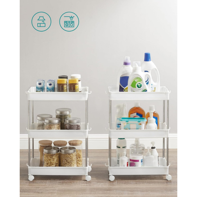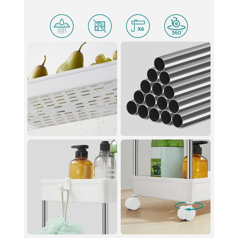 Mobilitate: 4 roti pivotante 360° Scurta descriere Caruciorul de bucatarie SONGMICS cu 3 niveluri este solutia ideala pentru spatii mici, oferind rafturi etajate incapatoare, carlige reglabile si roti pivotante pentru o mobilitate usoara. Designul slim permite integrarea in bucatarii, bai sau birouri fara a ocupa spatiu inutil.
