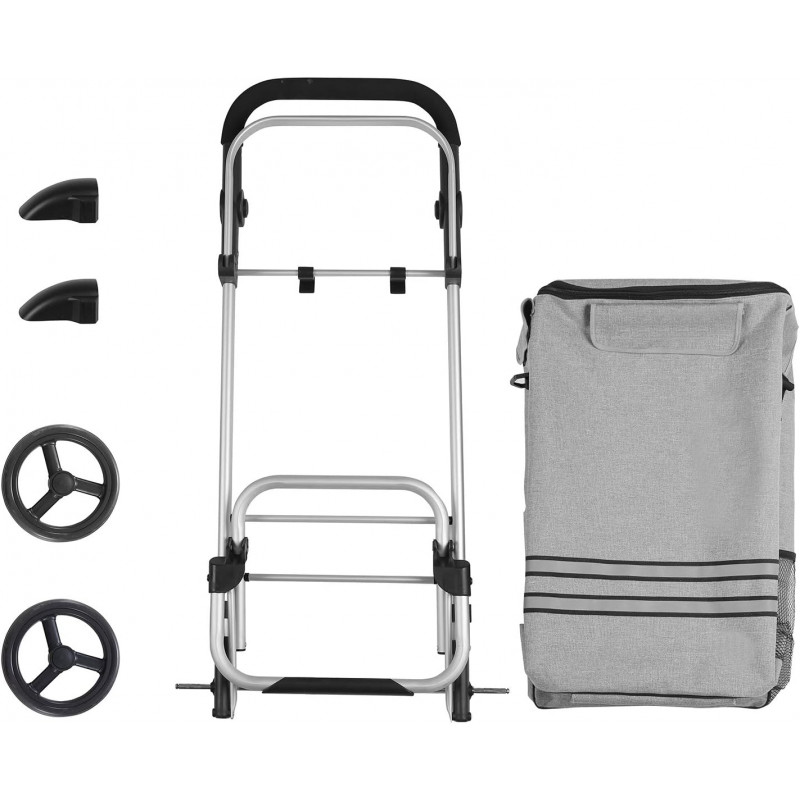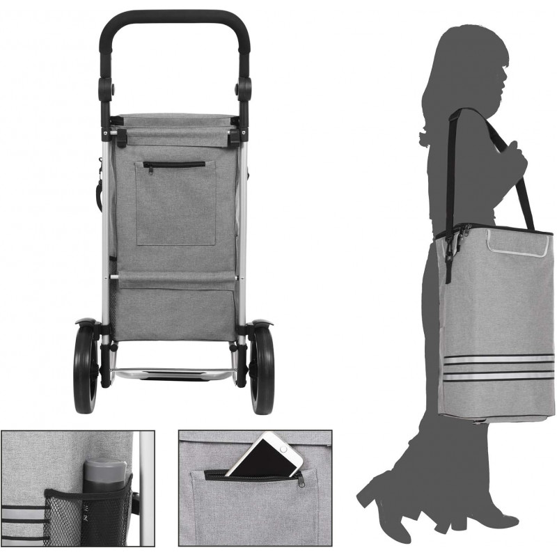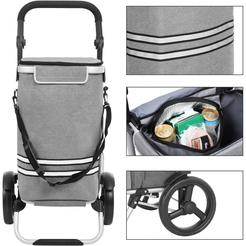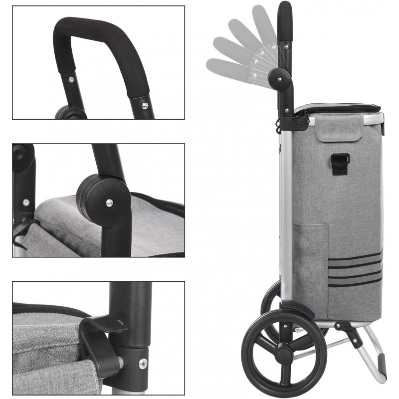 In cazul in care parasesti supermarketul mereu impovarat, este timpul sa iei un carucior de cumparaturi usor de rulat.Produsele songmics impresioneaza intotdeauna prin multifunctionalitate: rucsacul gri este usor de detasat si poate fi folosit si ca o geanta de umar eleganta in care puteti depozita articole de pana la 10 kg. Conectand din nou geanta la cadrul din aluminiu, sarcina rulmentului urca pana la 25 kg. Datorita designului inteligent, cosul de cumparaturi ramane solid si stabil chiar daca este incarcat complet.
