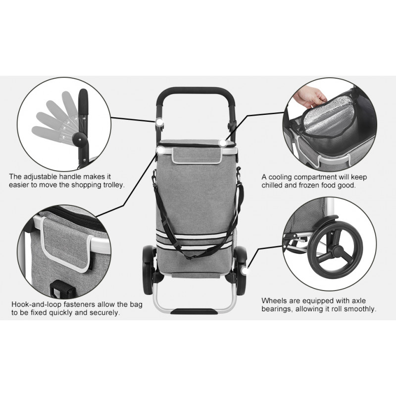 Detalii sofisticate: Datorita carligelor practice, puteti agata cu usurinta caruciorul nostru pe caruciorul de cumparaturi in supermarket. Cosul de cumparaturi este fabricat din tesatura de poliester rezistenta la apa si este usor de curatat.