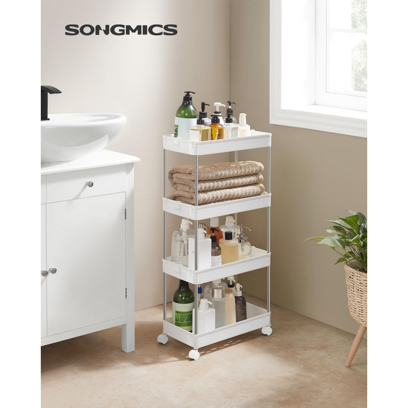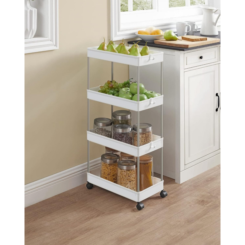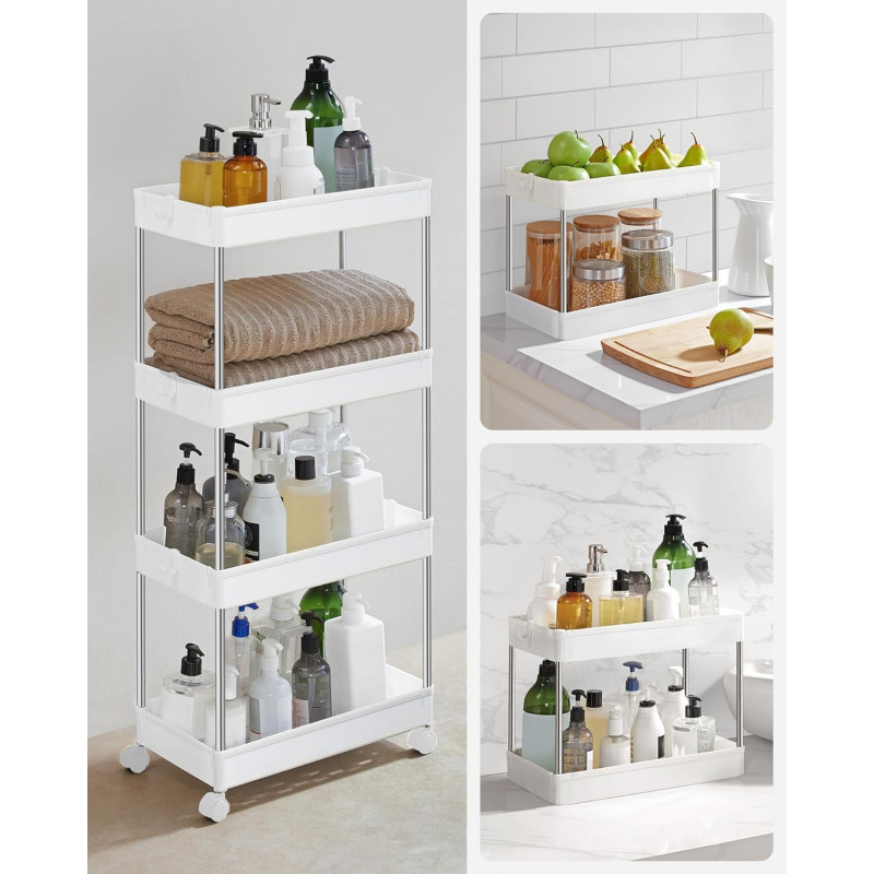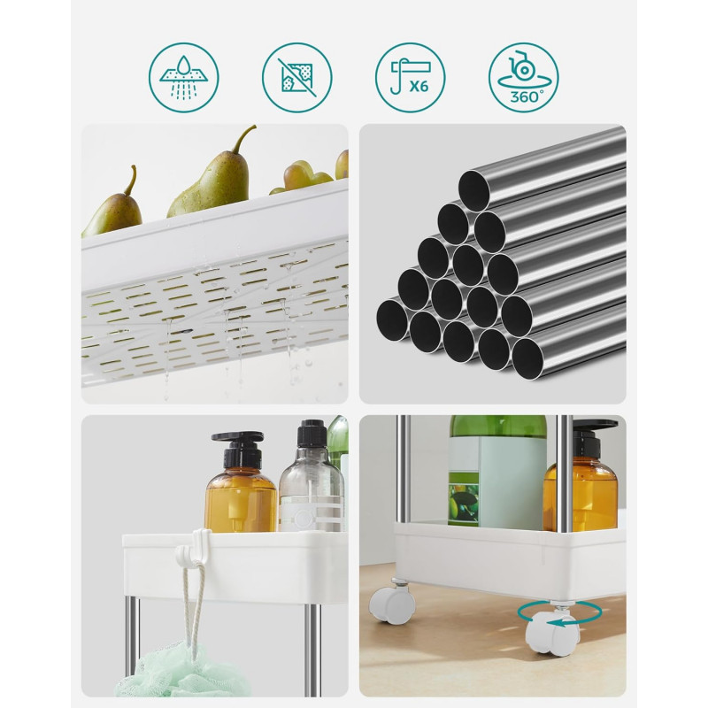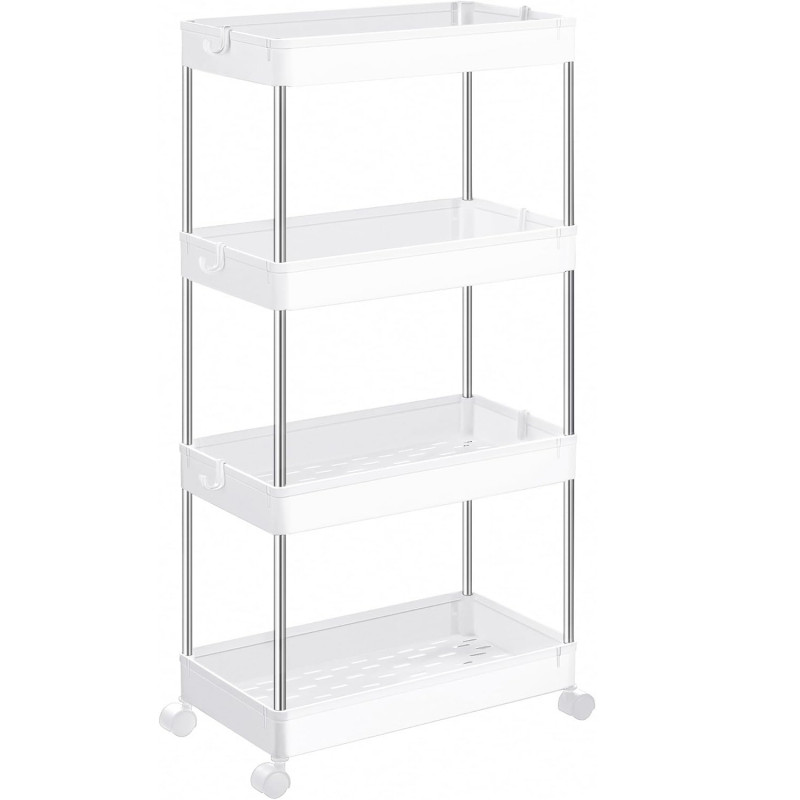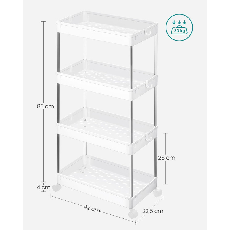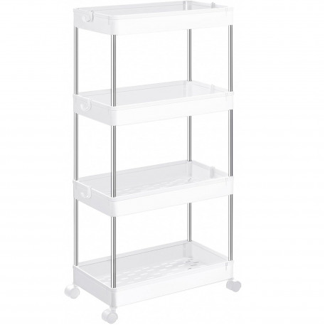 Capacitate de incarcare statica totala: 20 kg (5 kg pe raft) Despre acest articol Acest carucior de depozitare cu dimensiuni de 40 x 22 x 87 cm se poate potrivi in spatiile inguste din bucatarie, baie, dormitor sau spalatorie, pentru a va ajuta sa profitati la maximum de spatiul dvs. Datorita celor 4 roti pivotante netede, puteti muta caruciorul oriunde aveti nevoie de el, folosind spatiul din colt pentru a organiza sticlele de condimente sau consumabilele de baie. Acest carucior este prevazut cu 6 carlige detasabile pentru a agata manusi sau spatule pentru acces usor si depozitare flexibila. Caruciorul cu 4 niveluri poate fi impartit in doua rafturi cu 2 niveluri, sau o tava si un carucior cu 3 niveluri, astfel incat sa puteti decide daca sa le utilizati - pe chiuveta pentru consumabilele de baie sau pe blatul de bucatarie pentru a tine sticle, oale si tigai. Cu
