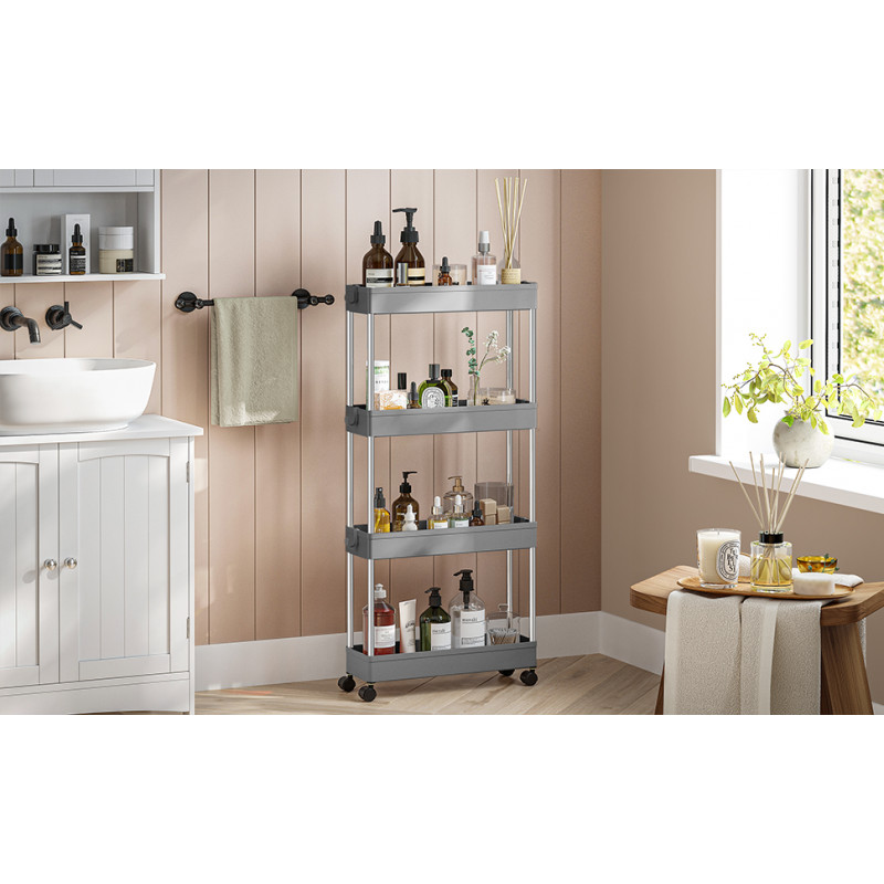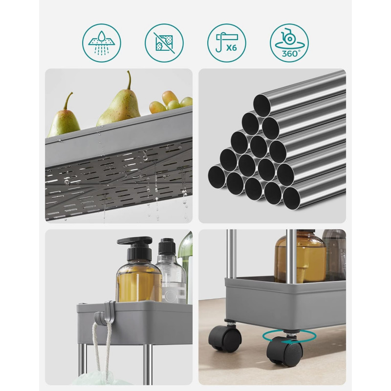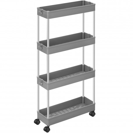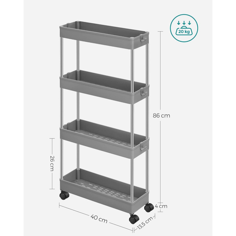 Capacitate maxima de incarcare statica in total: 20 kg (5 kg pe nivel) Despre acest articol Acest carucior de depozitare cu dimensiuni de 40 x 12,5 x 88 cm se poate potrivi in spatiile inguste din bucatarie, baie, dormitor sau spalatorie, pentru a va ajuta sa profitati la maximum de spatiul dvs.Datorita celor 4 roti pivotante netede, puteti muta caruciorul oriunde aveti nevoie de el, utilizand spatiul din colt pentru a organiza sticlele de condimente sau consumabilele pentru baie.Acest carucior de bucatarie este prevazut cu 6 carlige detasabile pentru a agata prosoape de bucatarie, sau spatule pentru acces usor si depozitare flexibila.Caruciorul cu 4 nivele poate fi impartit in doua rafturi cu 2 nivele, sau intr-o tava si un carucior cu 3 nivele, astfel incat puteti decide daca sa le folositi – pe chiuveta pentru consumabilele de baie sau pe blatul de bucatarie pentru a tine sticlele.Cu