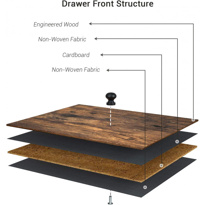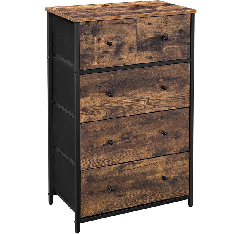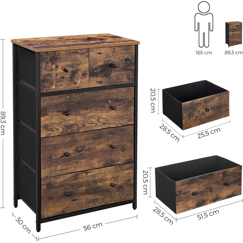 Scurta descriere: Comoda SONGMICS cu 5 sertare din material textil este ideala pentru organizarea eficienta a hainelor sau accesoriilor. Designul sau industrial imbina elemente vintage cu functionalitatea moderna. Cadrul metalic si blatul din MDF ofera stabilitate, in timp ce manerele din lemn completeaza aspectul elegant. Comoda este usoara, durabila si potrivita pentru orice incapere.