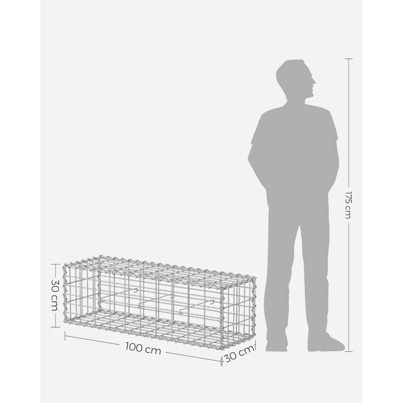 Culoare: gri/argintiu. Despre acest articol Otel solid cu diametrul de 4 mm: Acest cos gabion din otel galvanizat cu un diametru de 4 mm este solid, durabil, rezistent la rugina si coroziune si va decoreaza gradina sezon dupa sezon.Nu sunt necesare unelte pentru a asambla acest cos de piatra din metal! Pur si simplu aliniati grilele metalice adiacente si rasuciti tijele spiralate pentru a le conecta intre ele, gata!Carligele de distantare previn loviturile: 3 carlige de distantare incluse conecteaza strans intre ele panourile de gard opuse, astfel incat acest gabion isi pastreaza forma chiar si atunci cand este umplut cu pietre de zidarie sau alte materiale.In functie de nevoile dvs. sau de amenajarea camerei, puteti folosi aceste gabioane de piatra singure sau puteti combina mai multe dintre ele impreuna pentru a le folosi ca un ghiveci, o banca, o treapta de piatra sau o coloana in gradina dvs.Ce primesti: Un cos de sarma de 100 x 30 x 30 cm care ofera gradinii tale o reimprospatare instantanee si iti ofera posibilitati infinite de a-ti transforma spatiul exterior intr-o oaza unica si primitoare.