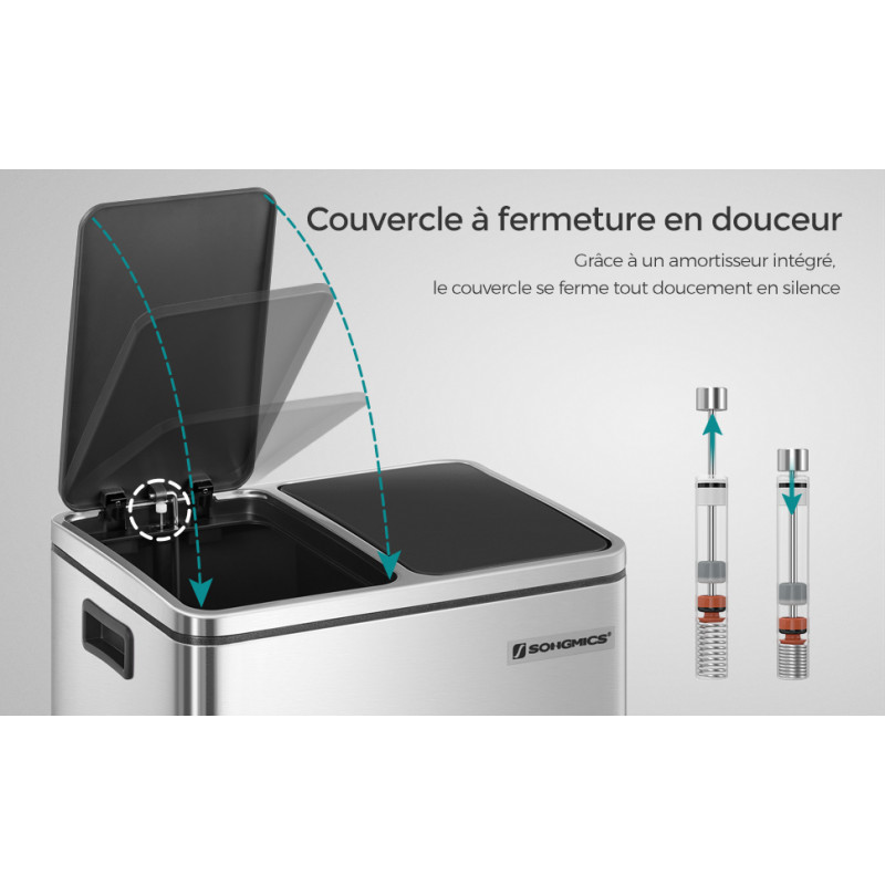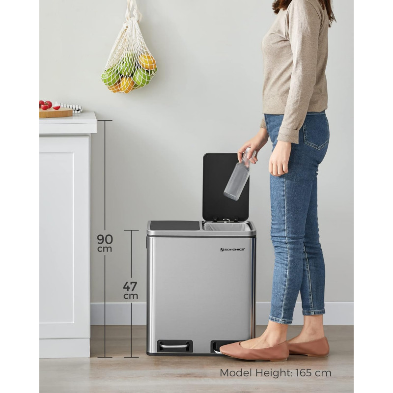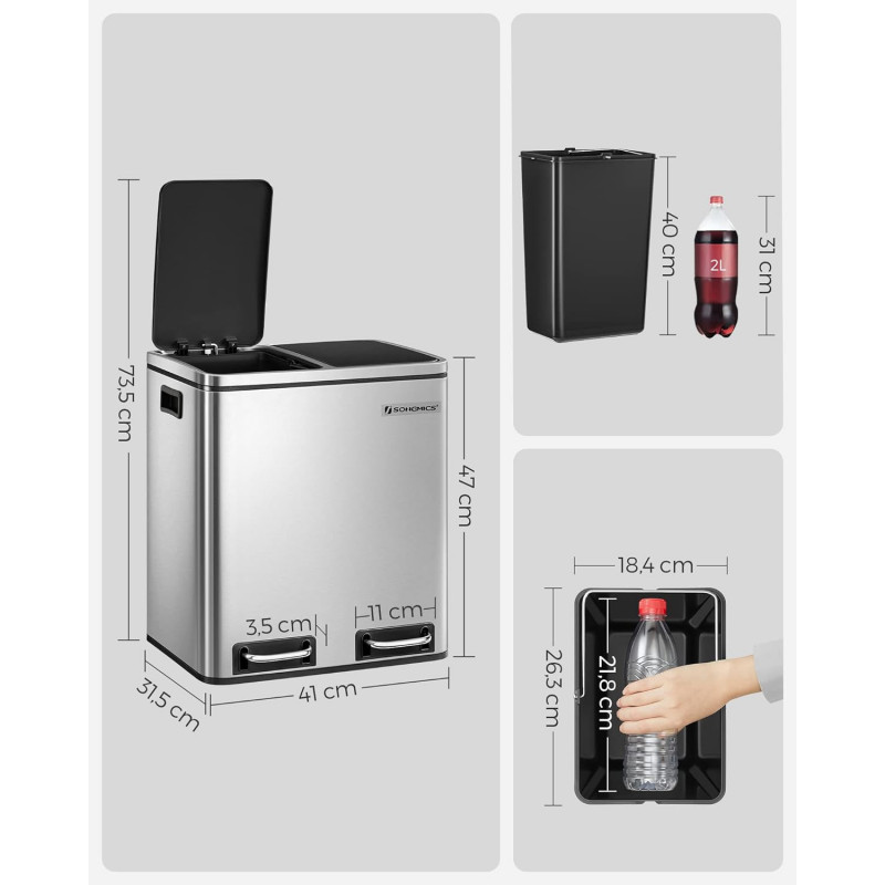 Dimensiuni pedala: 11 x 3,5 cm (L x l) Despre acest articol Culorile elegante si un design simplu, acest cos de gunoi este un punct de atractie in bucataria dvs.Aceasta pubela cu 2 compartimente faciliteaza reciclarea. Cu ajutorul pedalelor sale, nici macar nu va trebui sa o atingeti pentru a sorta!Chiar daca acest cos de gunoi are un exterior metalic rigid, el ramane plin de moliciune. Un mecanism special ii permite capacului sa se inchida incet si fara zgomot. Acest cos de gunoi este alcatuit din 2 garnituri interioare detasabile, care sunt usor de curatat. Daca sacul dumneavoastra se sparge si se varsa accidental, nu va faceti griji! Pur si simplu scoateti galetile cu manere metalice.Ce primesti: O pubela moderna de 15 L cu 2 galeti pentru recuperarea usoara a deseurilor. Faceti ordine in casa dvs. acum cu aceasta pubela practica si eleganta.
