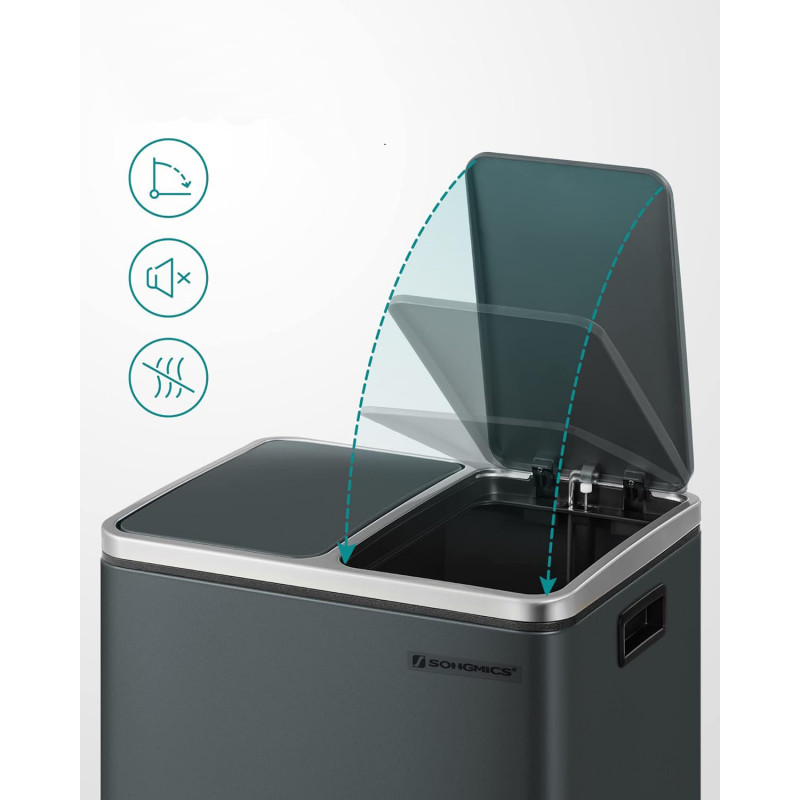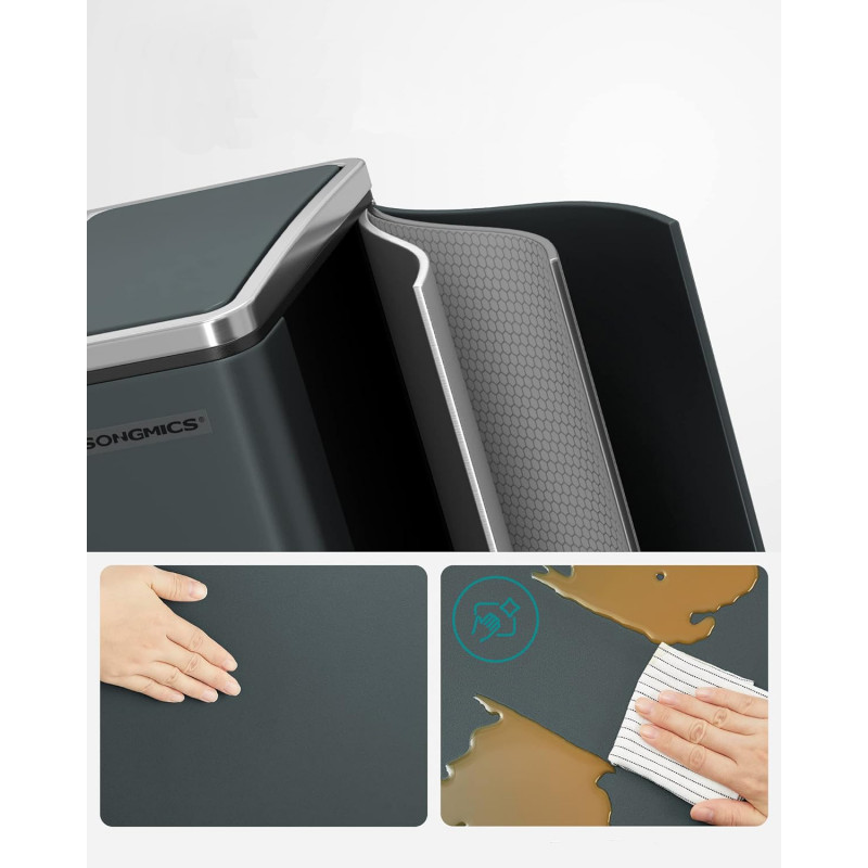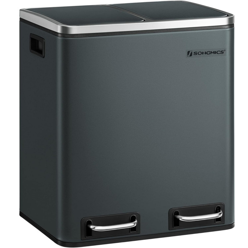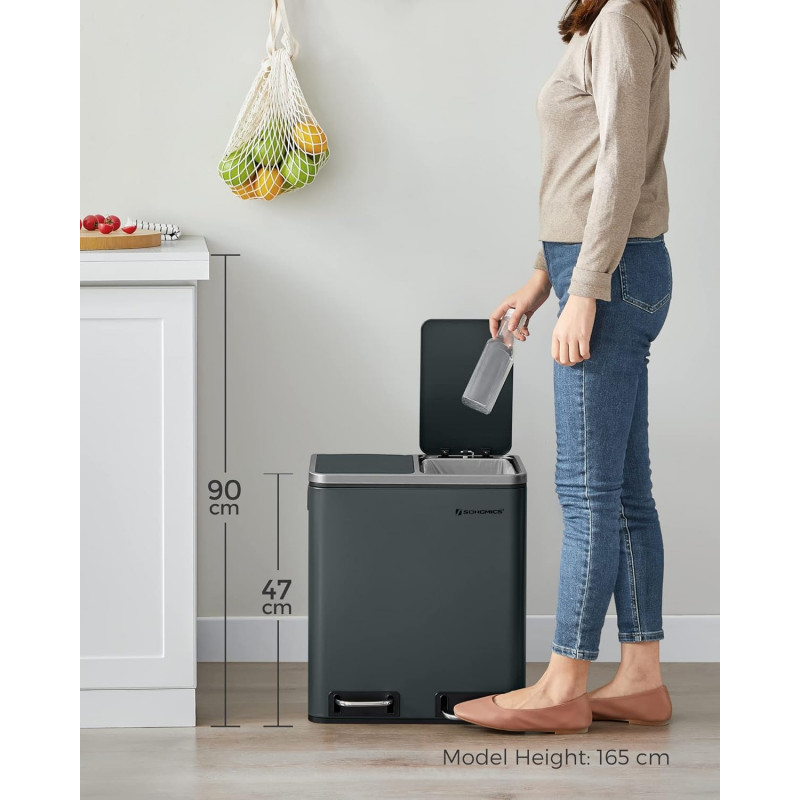 Greutatea produsului: 5.1 kg Despre acest articol Cu doua compartimente de 15 L, aceasta pubela cu pedala se potriveste perfect in bucatarii compacte, apartamente sau case mai mici si ajuta la gestionarea reciclarii. Doua compartimente va ajuta sa sortati deseurile normale de cele reciclabile, in timp ce fiecare are o galeata interioara detasabila, o pedala si un capac, astfel incat sa le puteti opera separat pentru o eliminare usoara a deseurilor.Cosul de gunoi din otel rezista la rugina, fiind, de asemenea, usor de curatat; finisajul gri verzui se combina cu luciul argintiu pentru un aspect modern care se potriveste oricarui decor de bucatarie.Capacele cosului de gunoi pot fi actionate cu piciorul pentru deschiderea fara maini si dispun, de asemenea, de o inchidere silentioasa si moale, fara zgomot. Cand este timpul sa curatati podeaua bucatariei, manerele de pe fiecare parte va permit sa mutati cu usurinta cosul dublu de gunoi.