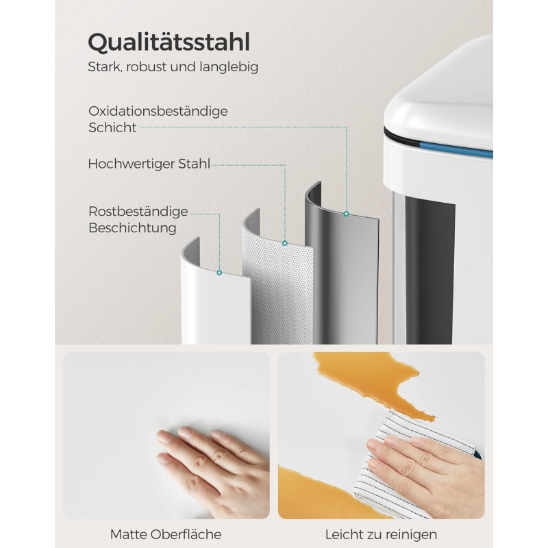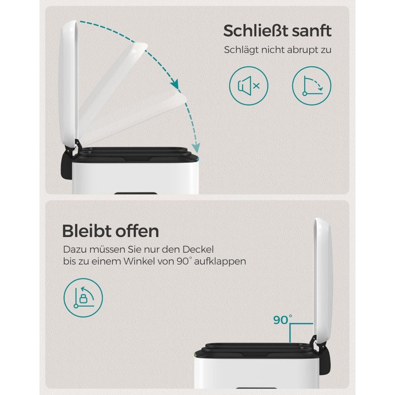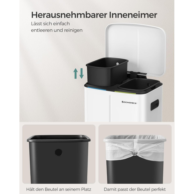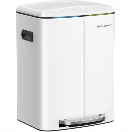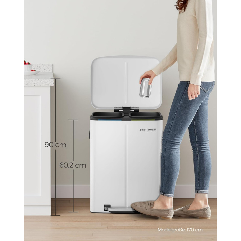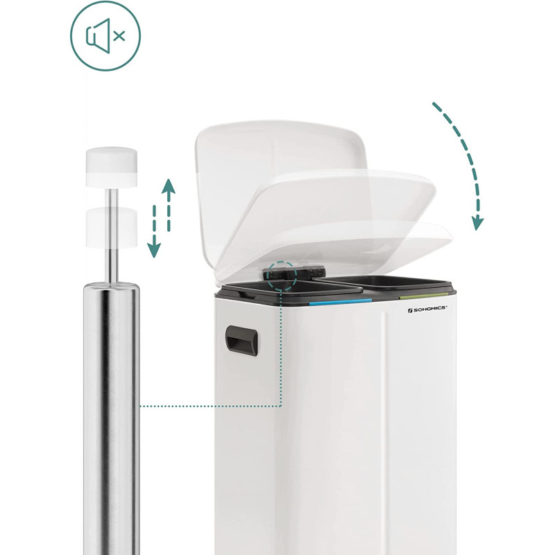 Instructiuni SONGMICS: Va rugam sa stergeti produsul cu o carpa moale, umeda si sa folositi detergent usor daca este necesar. Cosul de gunoi din bucataria dvs. trebuie sa fie remarcabil! Cu o culoare alba eleganta si un profil simplu, acest cos de gunoi va imbunatati aspectul bucatariei dvs. Depozitare usoara Acest cos cu pedala este format din 2 compartimente in care puteti sorta gunoiul. Cel mai important lucru este ca totul se face fara a fi nevoie sa atingeti pubela Galeata practica Acest cos de gunoi contine 2 galeti cu gauri pe spate pentru a facilita schimbarea sacilor de gunoi. Daca sacii se rup din greseala sau se rastoarna, scoateti direct galetile si curatati-le cu usurinta Viata de zi cu zi practica Cu acest cos de gunoi soft-close, eliminarea deseurilor nu a fost niciodata atat de usoara! Pur si simplu apasati pedala si eliminati. Bucurati-va de o viata mai curata si mai sanatoasa Design atent In ciuda exteriorului sau metalic rigid, acest cos de colectare selectiva a deseurilor este delicat: mecanismul de inchidere permite capacului sa se inchida usor, incet si silentios