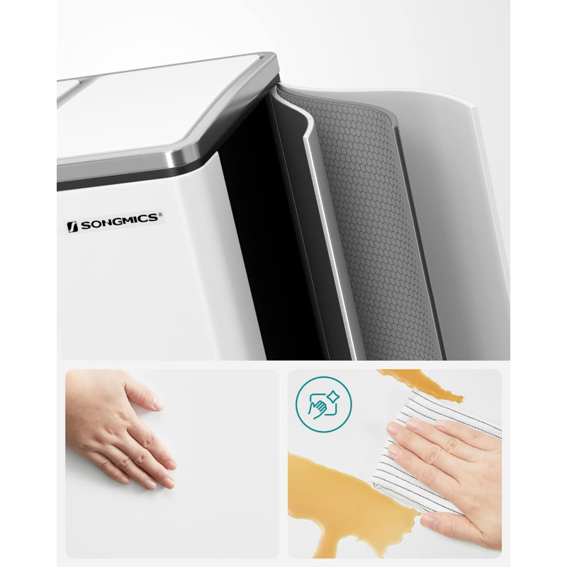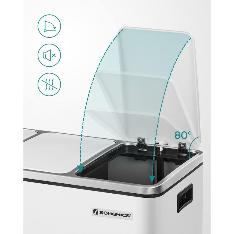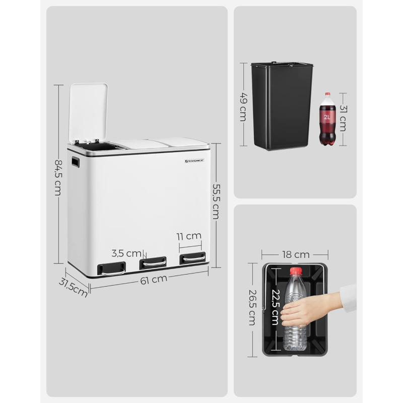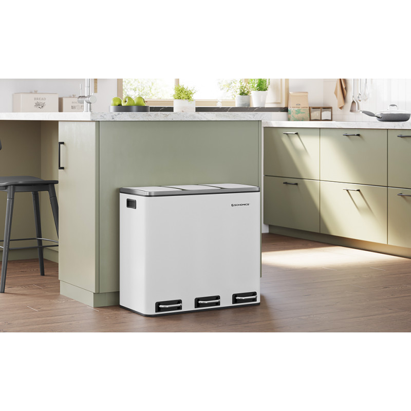 Greutatea produsului: 9,1 kg Despre acest articol Cu acest cos de gunoi cu trei compartimente de 18 litri, puteti depozita gunoiul, de exemplu, deseuri de ambalaje, deseuri organice si deseuri reziduale.Cosul de gunoi pentru bucatarie este fabricat din otel si este rezistent la rugina. Pur si simplu stergeti suprafata cosului de gunoi cu o carpa umeda.Capacele cosului se inchid incet, silentios si delicat pentru a preveni zgomotul neplacut.Linii clare, culoare neagra eleganta - Acest sistem de separare a deseurilor are un aspect modern si se potriveste perfect cu alte obiecte de mobilier si aparate de uz casnic.Usor de deschis si golit: Pur si simplu apasati pe pedala pentru a deschide capacul acestui cos de gunoi fara a atinge cosul cu mana. Galetile interioare pot fi ridicate si golite cu usurinta datorita manerului metalic.