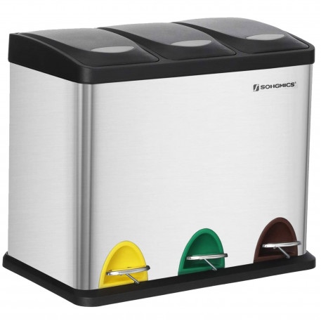 Material: Carcasa din otel inoxidabil; Galeata interioara din plastic. Rezistent la zgarieturi si rugina. Cu acest separator de gunoi (24 L) sortarea gunoiului este o joaca de copii. O sortare tripla este foarte practica cu cele trei insertii (fiecare 8 L). Otelul inoxidabil de inalta calitate garanteaza o durata lunga de viata si contribuie la un aspect elegant. Mecanism silentios al pedalei pentru deschidere: Deschidere usoara si confortabila datorita mecanismului pedalei. Mecanismul piciorului este foarte confortabil si nu necesita forta bruta in picioare. Pedalele sunt colorate izbitor. Pedalele anti-alunecare faciliteaza deschiderea. In utilizarea de zi cu zi, se dovedeste a fi foarte stabil si silentios. Impartire practica in 3 containere interioare: 3 pubele interioare robuste din plastic negru de inalta calitate (PE-polietilena). Cele trei pubele detasabile sunt perfect adecvate pentru separarea deseurilor si, datorita manerelor cromate, asigura o golire rapida si necomplicata.