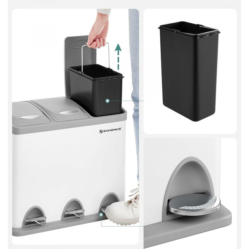 Un plus important: Cele 3 pedale ale acestui cos de gunoi cu pedale sunt disponibile in 3 culori diferite, astfel incat sa puteti gasi rapid locul potrivit pentru deseurile dvs. O ocazie minunata de a va invata copiii separarea deseurilor. In sfarsit, gata cu mizeria: Oh, nu. Captuseala pubelei este deja rupta din nou si cosul de gunoi este foarte lipicios in interior. Nu intrati in panica, pubela interioara poate fi scoasa cu usurinta din containerul de deseuri cu ajutorul manerelor si curatata cu usurinta.