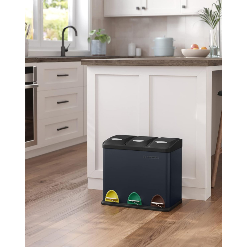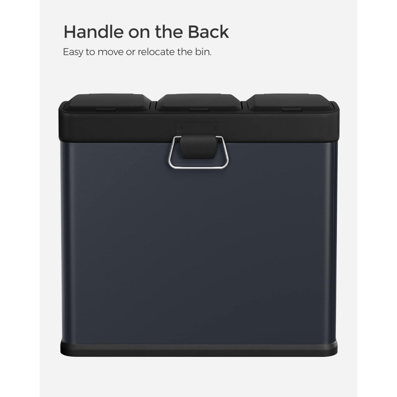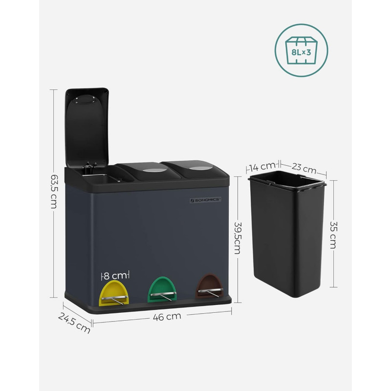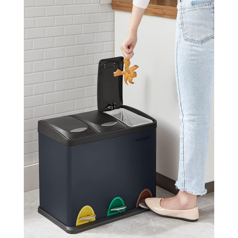Dimensiunea totala a produsului: 47 x 28,3 x 39,5 cm Despre acest articol Practic si elegant, acest cos de gunoi cu pedala si 3 galeti faciliteaza sortarea deseurilor. Deschiderea pedalei este super convenabila atunci cand aveti mainile pline.In ciuda exteriorului sau rigid din otel, acest cos de reciclare functioneaza delicat. Mecanismul tampon permite inchiderea lenta, linistita si flexibila a capacului, pastrand mirosurile si bacteriile inauntru.Galeti detasabile: Hopa! S-a rupt sacul de gunoi si s-a scurs lichid pe podea? Nu va faceti griji, fiecare galeata detasabila este dotata cu un maner pentru a fi golita si curatata cu usurinta.Asezati acest cos dreptunghiular pe perete pentru a economisi spatiu. Nu atinge peretele atunci cand se deschide.CE PRIMITI: O pubela neagra cu 3 galeti de 8 L pentru a va ajuta la sortarea deseurilor. Va va face viata mai usoara!