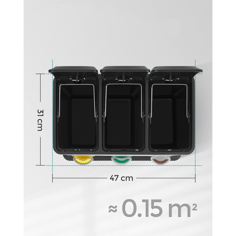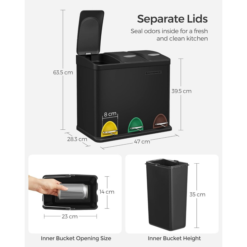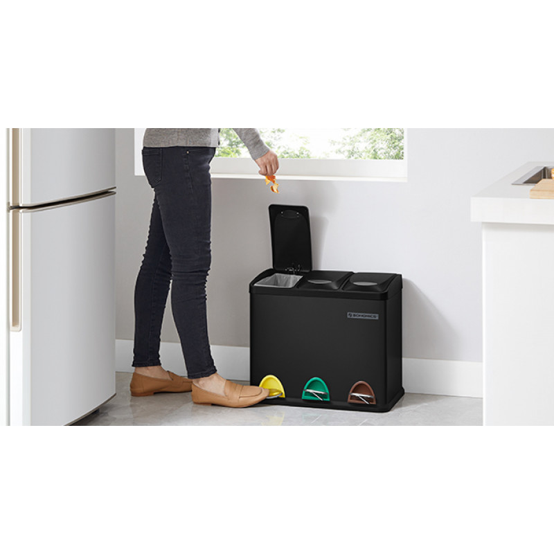 Remarcabil in detaliu: Capacele ermetice pastreaza mirosurile in interior; cele 3 pedale elegante cu un design elaborat nu sunt doar usor de calcat, ci si placute la vedere, ceea ce duce la un obicei de sortare a deseurilor in intreaga familie.