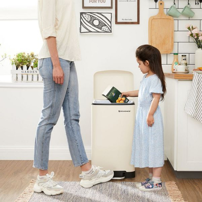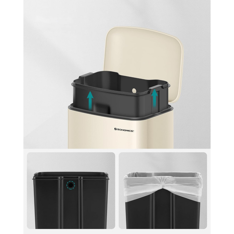 Siguranta si curatenie: Spatiul de pe spatele galetii interioare va permite sa glisati marginile sacului in cosul de gunoi pentru a-l mentine in pozitie si a ascunde marginile inestetice. Deschiderea din partea din spate a galetii interioare mentine sacul de gunoi intins si ramane intotdeauna in pozitie. Daca un sac de gunoi se rupe vreodata, puteti ridica galeata interioara din recipientul de gunoi folosind manerele laterale si puteti curata cu usurinta.