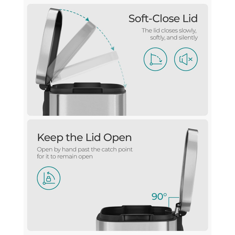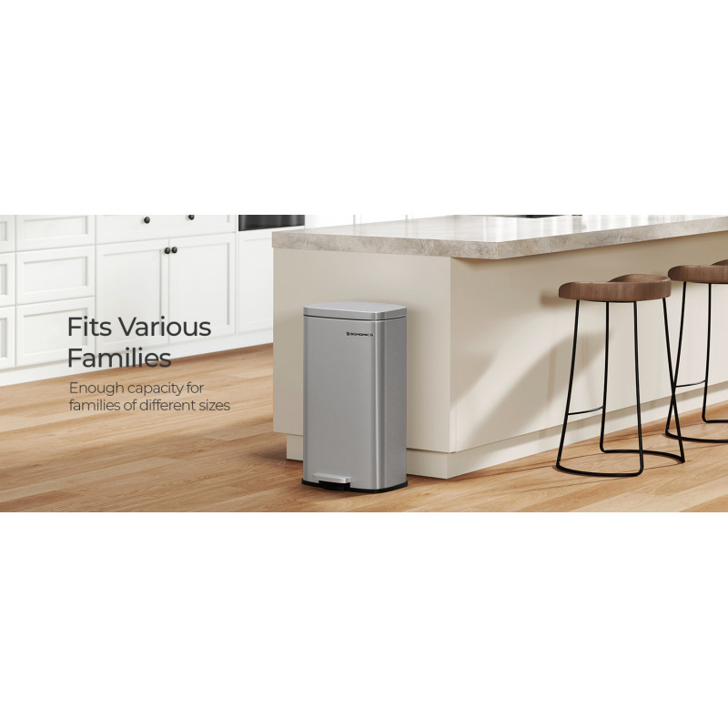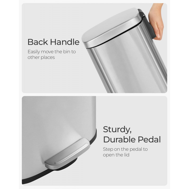 Greutatea produsului: 3,8 kg Despre acest articol Cu un volum de 30 L si dimensiuni de 34,8 x 29,7 x 63,3 cm, acest cos de gunoi ofera o multime de spatiu fara a aglomera camera. Designul sau modern se potriveste cu multe amenajari interioare.Acest cos de gunoi cu pedale are un capac care se inchide incet si fara zgomot. Sigiliul capacului rezistent la scurgeri si impiedica raspandirea mirosurilor.Capacul acestui cos de gunoi de bucatarie poate fi deschis cu ajutorul pedalei sau cu mainile deasupra punctului de blocare, astfel incat sa ramana deschis.Fabricat din otel de calitate, acest cos de gunoi modern este rezistent la rugina pentru o utilizare indelungata, este usor de curatat cu o carpa umeda pentru a preveni aparitia dungilor.Sacii de gunoi pot fi fixati prin plierea marginilor sacilor in orificiul din spate al galetii interioare detasabile. Daca este necesar, manerul din spate poate fi utilizat pentru a-i schimba locul.
