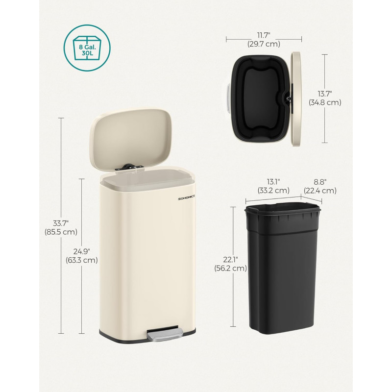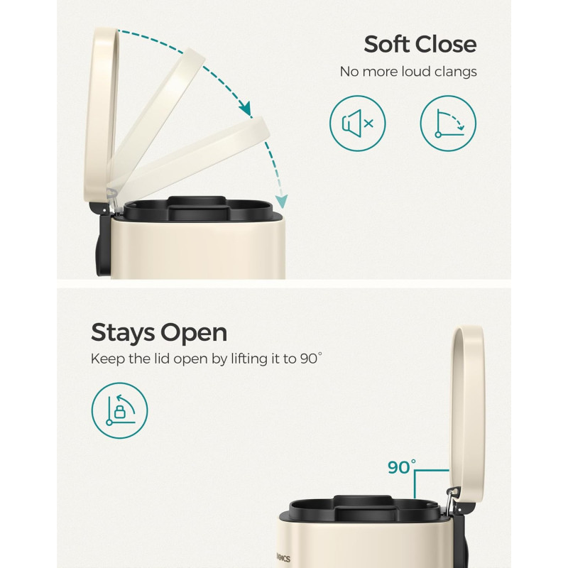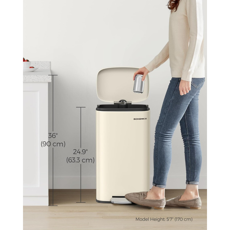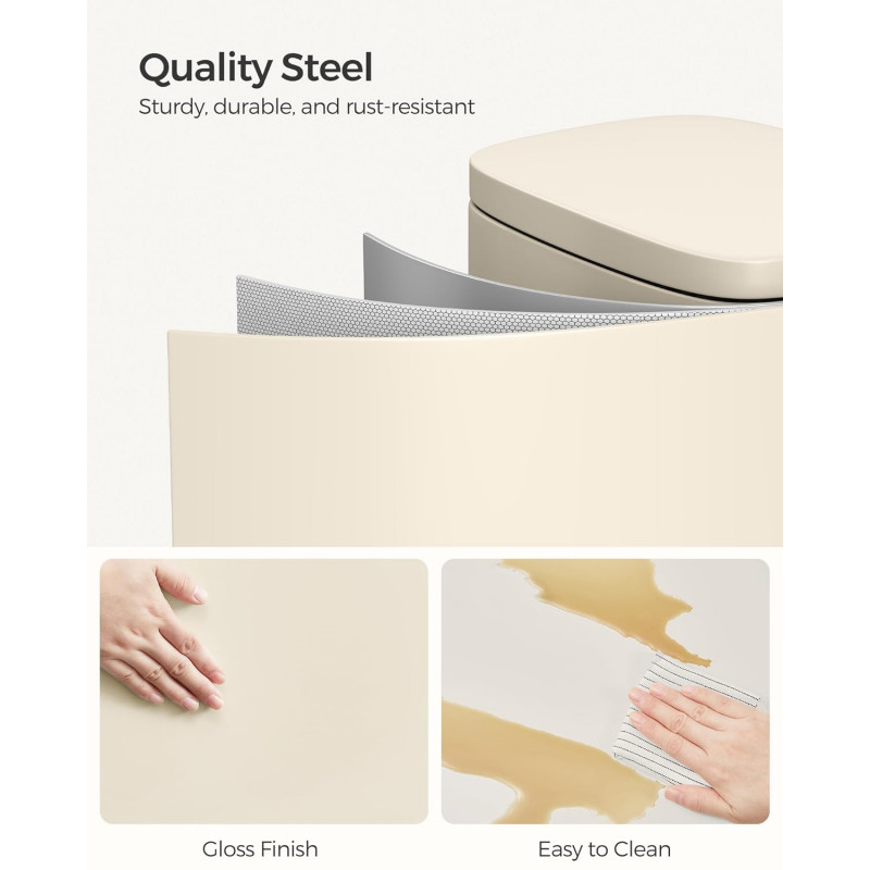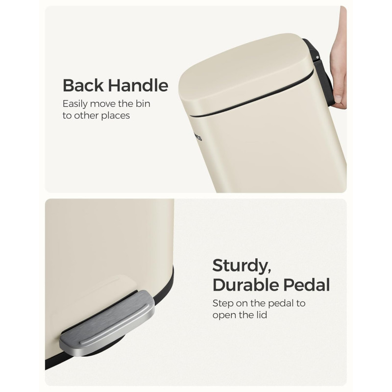 Scurta descriere: Cosul de gunoi SONGMICS de 30 L este alegerea ideala pentru o bucatarie moderna si organizata. Designul elegant in nuanta bej se integreaza usor in orice decor, iar mecanismul cu pedala si inchidere silentioasa ofera confort si igiena in utilizare zilnica.