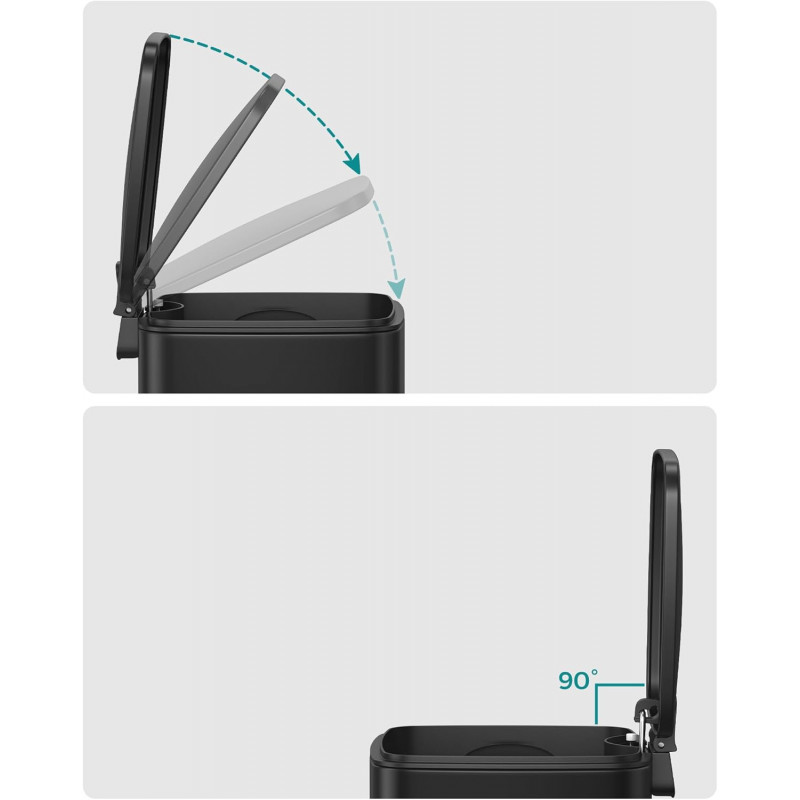 Marca SONGMICSCapacitate 6 litri Culoare Negru Mecanism de deschidere Step-On, Pedala Tip finisaj Vopsit Greutatea articolului 0.8 Kilograme Dimensiunile produsului 23.9 L x 19.3 W x 25.5 H centimetri