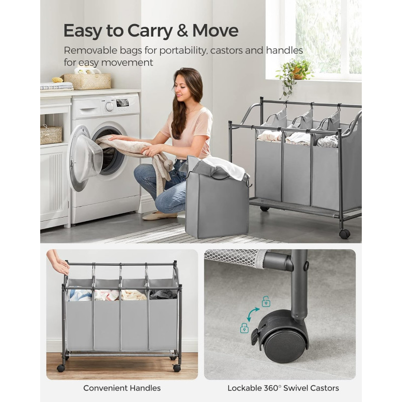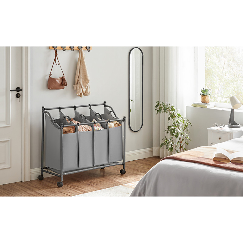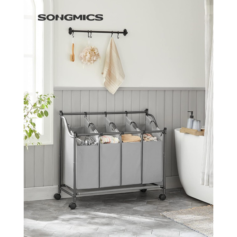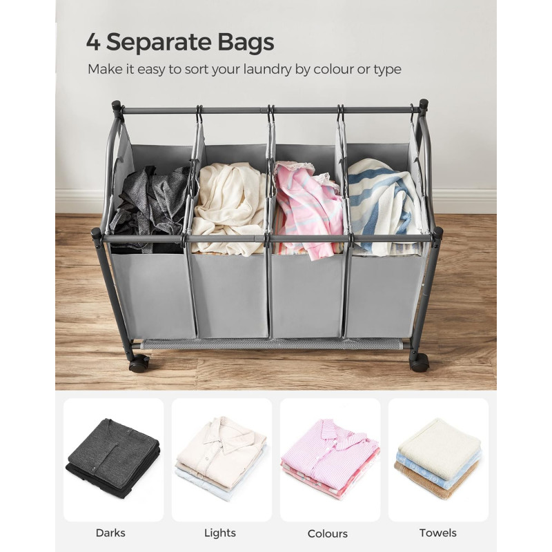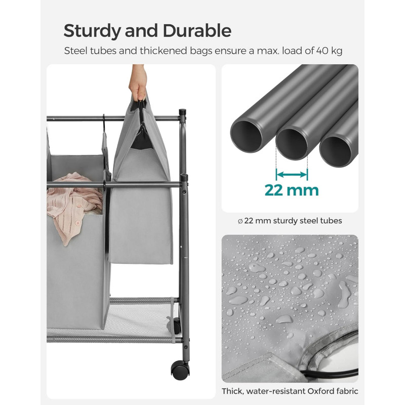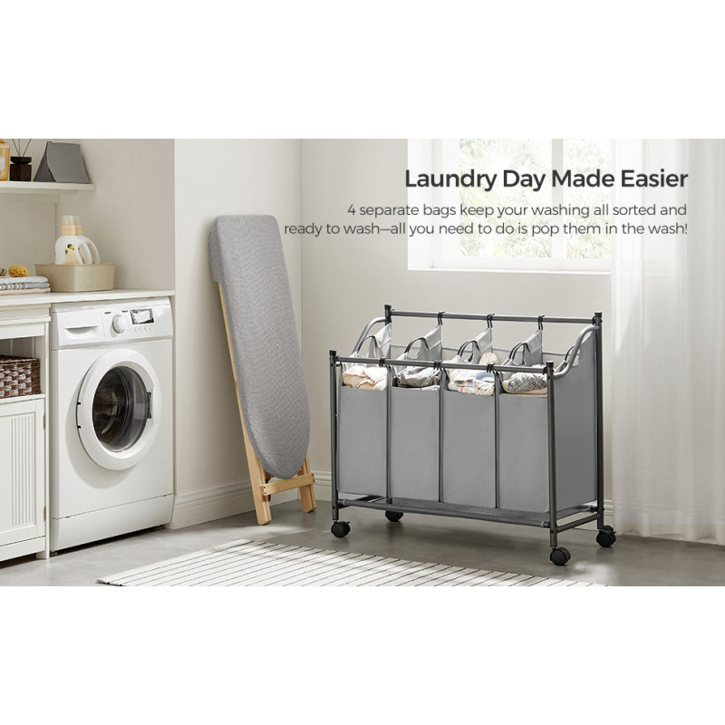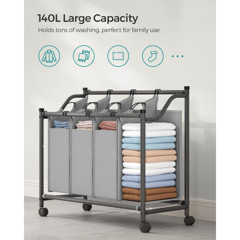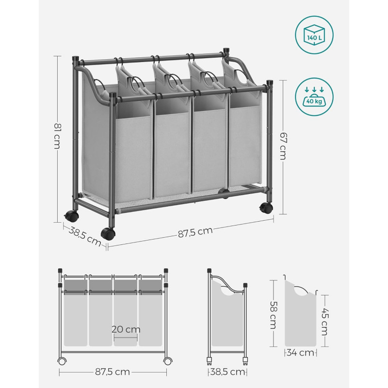 Capacitate de incarcare statica a fiecarui sac: 10 kg Despre acest articol Acest cos de rufe cu 4 saci are un spatiu de depozitare total de 140 de litri pentru a pastra toate rufele din gospodarie intr-un singur loc si organizate, economisind gramezi de haine imprastiate pe podea.Cu 4 saci de spalat separate, acest sortator de rufe va pastreaza rufele sortate dupa culoare sau tip si gata de plecare, reducand timpul de sortare.Cele 4 pungi de rufe cu manere metalice sunt detasabile, astfel incat sa puteti scoate orice punga cu usurinta si sa o duceti la masina de spalat pentru a o descarca; Fiind acoperite cu PVC inseamna ca aceste pungi sunt rezistente la apa si usor de curatat.Tesatura Oxford 600 D, ingrosata, rezistenta la uzura, sustinuta de un material solid de 22 mm dia. tuburi de otel, rezulta intr-un carucior de rufe solid, stabil si durabil, care sustine pana la 40 kg in total.
