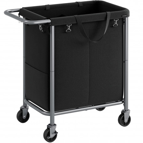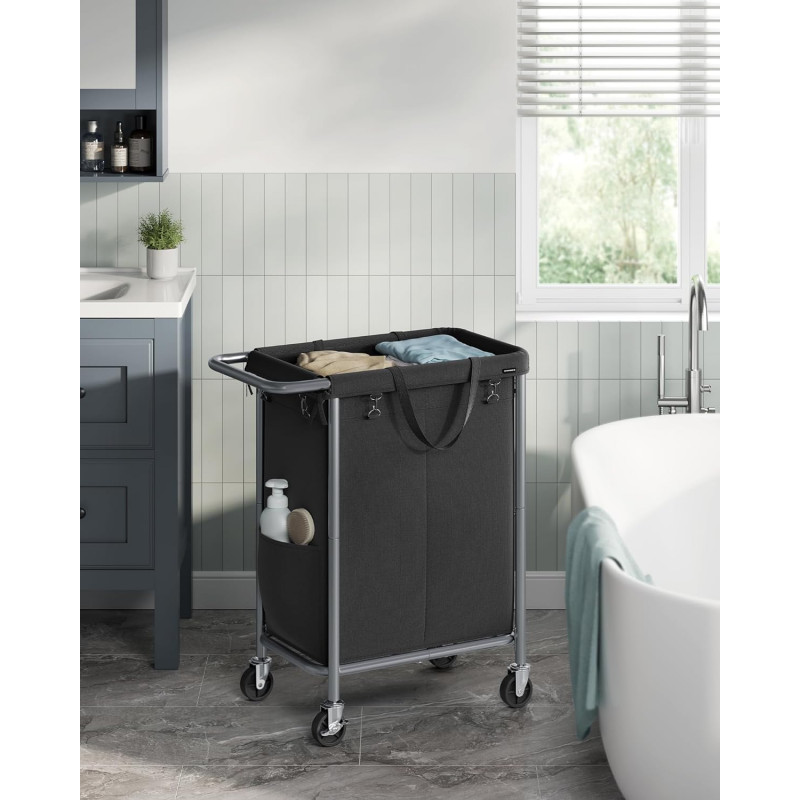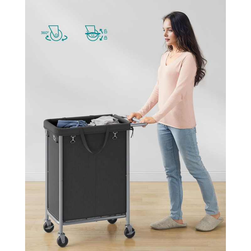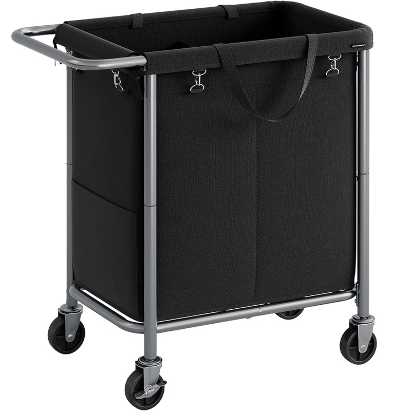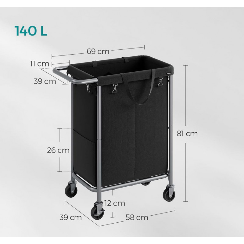 Capacitate maxima de incarcare statica: 20 kg Despre acest articol Cu o dimensiune de 69 x 39 x 81 cm si doua compartimente de 70 de litri, acest cos de rufe ofera suficient spatiu de depozitare pentru a depozita rufele sortate. Sacul cosului de rufe poate fi indepartat cu usurinta si poate fi transportat confortabil pe scari cu ajutorul manerelor. Datorita elementelor de fixare atasate, puteti fixa sacul de rufe in mod ferm pe cadru.Fabricata din tuburi groase de otel cu diametrul de 22 mm, structura cosului de rufe este stabila si fara oscilatii. In plus, caruciorul de rufe poate sustine pana la 20 kg. Datorita celor 4 roti, dintre care 2 cu frana, acest cos de rufe poate fi deplasat si blocat cu usurinta. In plus, cosul de rufe are un maner care se afla la o inaltime confortabila, astfel incat nu trebuie sa va aplecati atunci cand il impingeti.Durabil si hidrofug: Sacul fabricat din tesatura Oxford 600 D de inalta calitate este rezistent la rupere si, prin urmare, durabil. Interiorul sau este, de asemenea, echipat cu un strat hidrofug si este usor de curatat.
