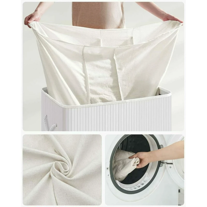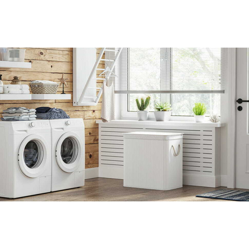 Stabilitate complet imbunatatita: Panoul de lemn din partea de jos este conectat la captuseala interioara a cosului de rufe; in plus, placa de baza imbunatatita ofera intregului cos o fixare stabila; Blugi, pulovere, jachete de iarna, lenjerie de pat? Nici o problema! Cutia de rufe poate fi incarcata cu pana la 25 kg. Este posibila separarea in functie de culoare: Sacul de rufe din bumbac respirabil este impartit in 2 compartimente – unul pentru rufe deschise, unul pentru cele inchise la culoare si unul pentru cele colorate. Masurand 60 x 40 x 61,5 cm, acest cos spatios de 150 de litri va va gazdui toate rufele si va va mentine casa perfect ordonata.
