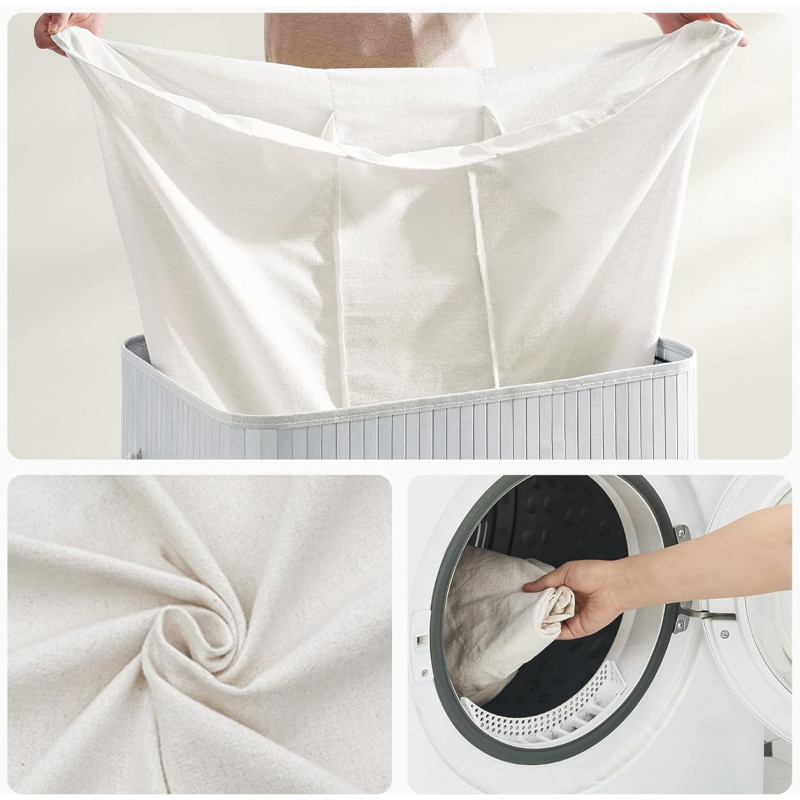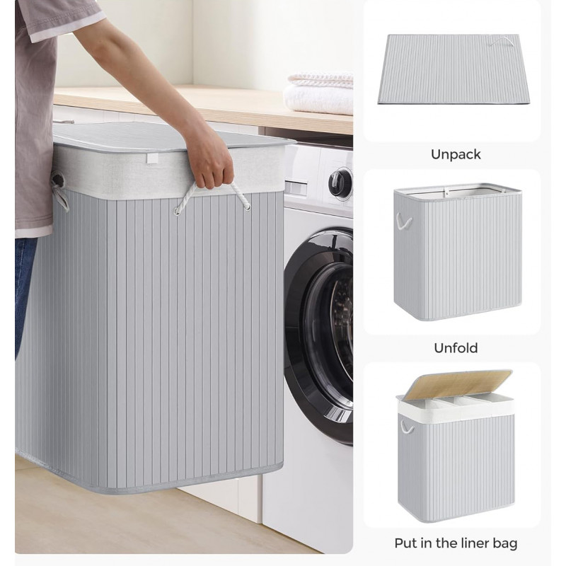 Prindeti capacul: Designul clipului usureaza lucrurile - acum dureaza doar cateva secunde sa prindeti capacul pe cosul de rufe; scoateti-l cu usurinta daca doriti sa scoateti sacul de captuseala si sa va transportati rufele la masina de spalat.Sortati in timp ce aruncati: Sortati in prealabil hainele deschise, inchise la culoare si delicate cu acest cos de rufe cu 3 saci in timp ce le puneti inauntru, astfel incat sa nu trebuiasca sa sapati prin rufele murdare pentru a le separa in ziua spalarii.Stabilitate cu scop: Lamelele de bambus sunt regenerabile si durabile, mandrindu-se cu o mare stabilitate si rezistenta ridicata. Aveti acest cos de rufe care rezista la 25 kg in dormitorul dvs. pentru a tine blugi, pulovere si jachete de iarna fara probleme!O multime de spatiu: Paltoane, blugi, lenjerie, prosoape... aruncati toate rufele in acest cos. Cu dimensiuni de 60 x 40 x 60,5 cm, acest cos spatios de 150 L le va gazdui pe toate si va va mentine casa intr-o ordine perfecta.Ce primesti: Un cos de rufe din bambus de 150 L, cu 3 sectiuni, care va permite sa inghesuiti toate hainele murdare si lenjeriile de pat pentru a va face ziua de spalare a rufelor floare la ureche.