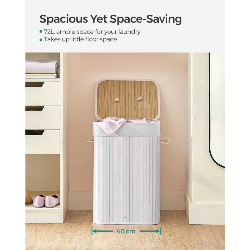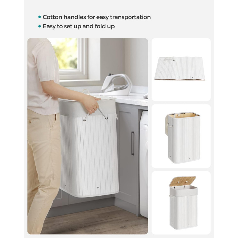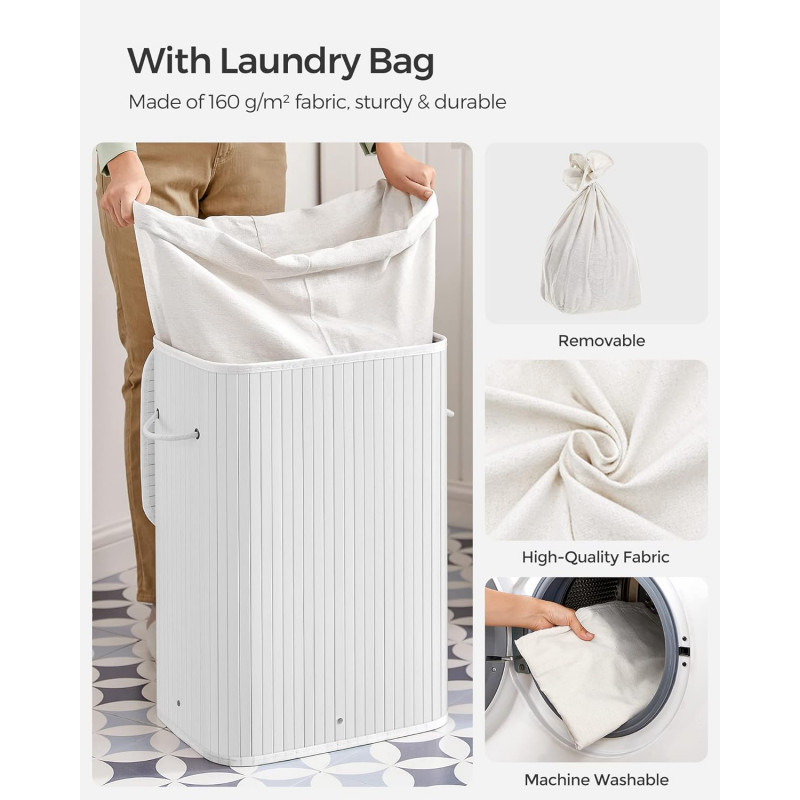 Greutatea produsului: 2,2 kg Despre acest articol Capacul cosului poate fi deschis si inchis cu o singura mana pentru a va facilita depozitarea rufelor. Capacul previne mirosurile neplacute si va protejeaza rufele de praf.Acest cos de rufe de 40 x 30 x 60 cm ofera suficient spatiu de depozitare (72 L) pentru prosoape, haine si lenjerie de pat. Datorita constructiei sale, ocupa putin spatiu pe podea.Benzile de bambus cu latimea de 17 mm fac cosul de rufe foarte solid, stabil si rezistent (sarcina maxima de 20 kg). Atunci cand nu este utilizat, poate fi pliat si depozitat intr-un mod care economiseste spatiu.Geanta de captuseala realizata din tesatura de bumbac de 160 g/m² este detasabila, astfel incat sa o puteti lua cu usurinta in spalatorie. Cand se murdareste, pur si simplu se spala la masina.Datorita structurii simple si a