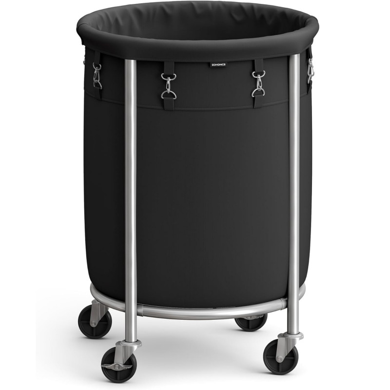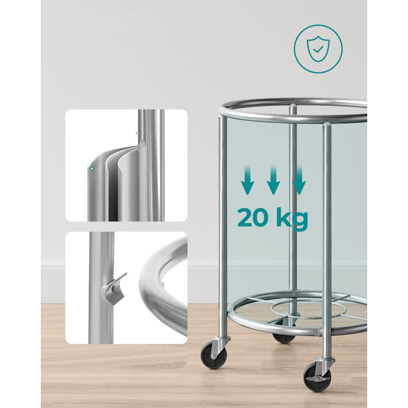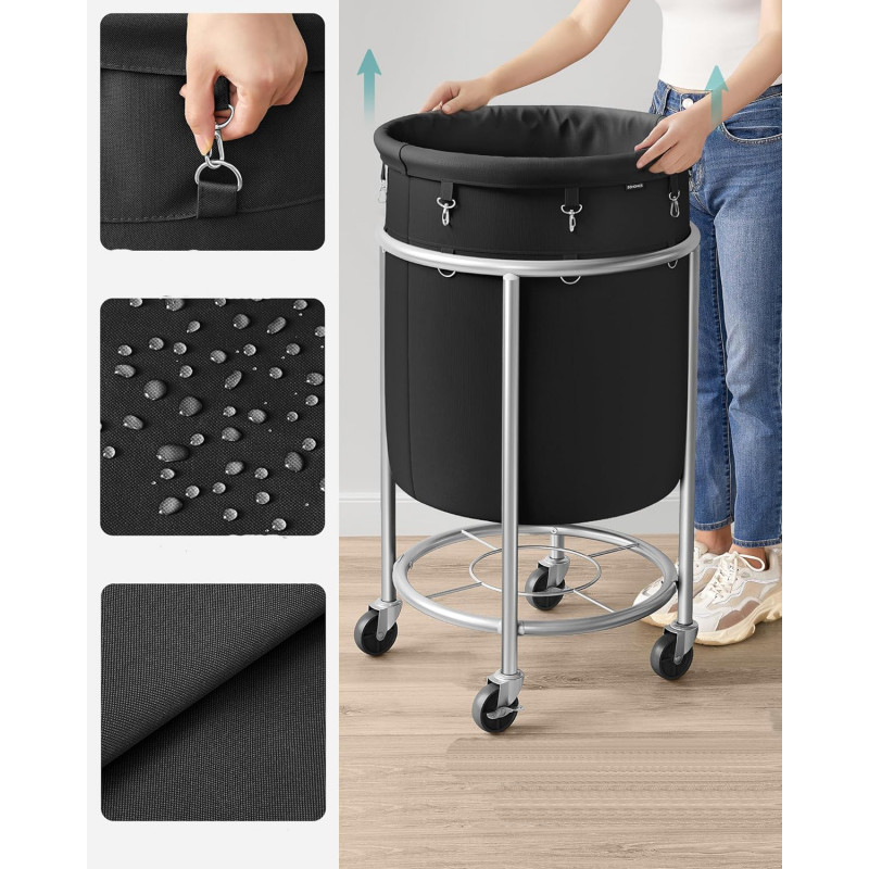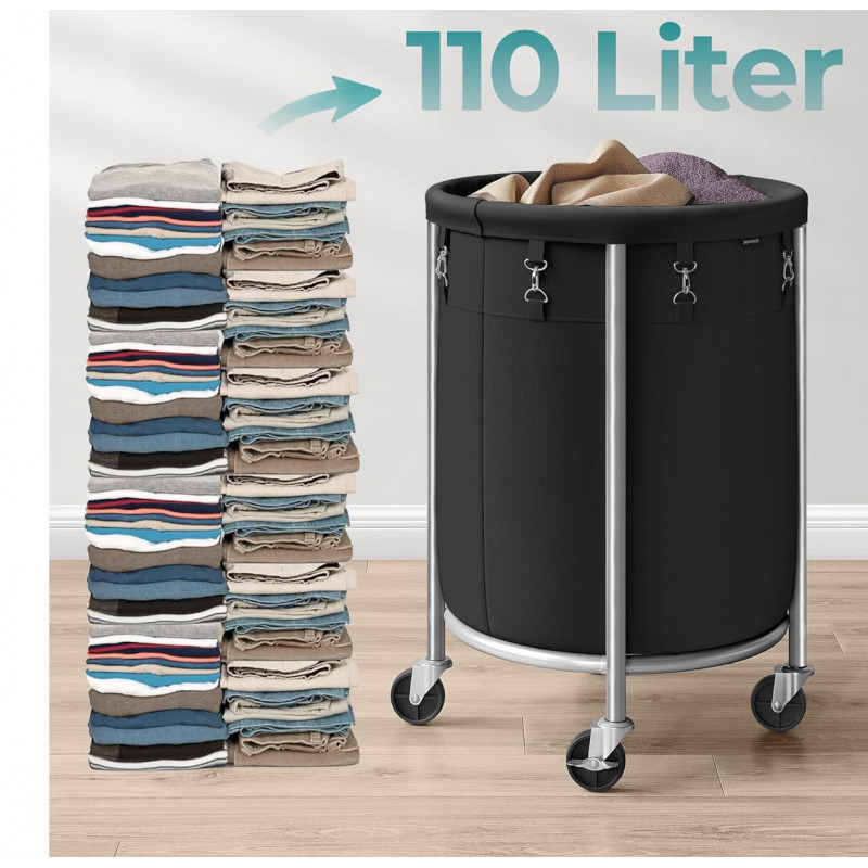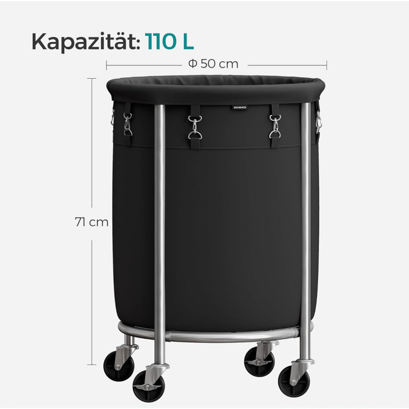 Sarcina statica: 20 kg Despre acest articol Cosul de rufe are 50 x 71 cm (diametru x inaltime) si ofera suficient spatiu de depozitare (110 litri) pentru a depozita toate rufele unei familii timp de o saptamana.Constructia cosului de rufe este realizata din tuburi de otel si este intarita de piese in forma de U. Datorita acoperirii cu pulbere, tuburile de otel sunt rezistente la apa si rugina. Geanta pentru rufe este fabricata din tesatura de poliester 600 D de inalta calitate si este echipata cu o suprafata interioara impermeabila din PVC. Datorita elementelor de fixare, sacul nu cade si este, de asemenea, usor de indepartat.Usor de mutat: Datorita celor 4 roti rezistente (2 dintre ele cu frana), puteti impinge cu usurinta cosul de rufe din dormitor pana in spalatorie sau il puteti fixa intr-un singur loc. Datorita pieselor marcate si a