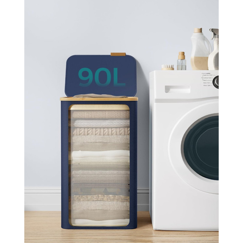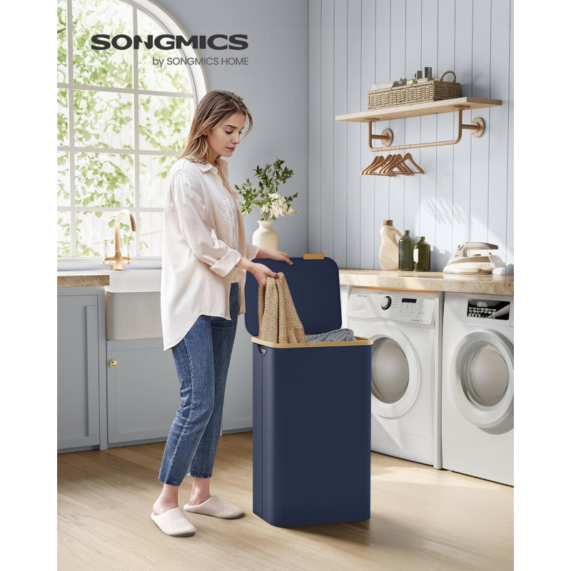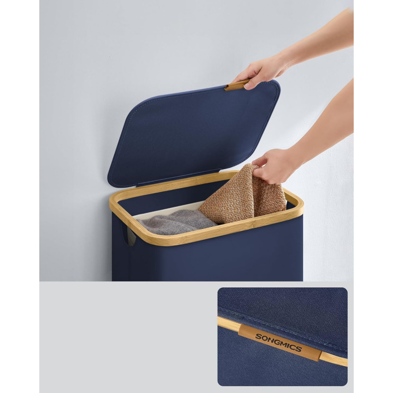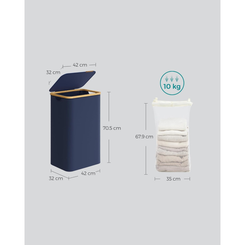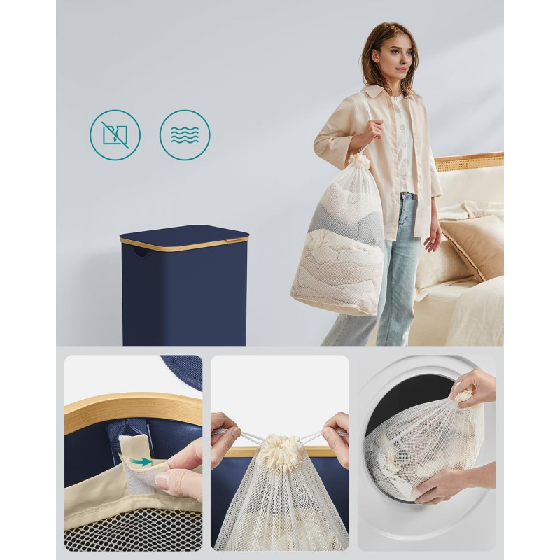 Pachetul include: 1 x Cos de rufe1 x set de accesorii1 x manual de utilizare Note VASAGLE: Nu este recomandat sa depozitati cosul de rufe intr-un mediu umed pentru o perioada lunga de timp pentru a evita deteriorarea.Evitati sa asezati obiecte grele pe capac pentru a nu-l deteriora.Nu depozitati obiecte ascutite in acest cos de rufe pentru a evita deteriorarea sau ranirea. Spatios Acest cos de rufe de 90 L cu dimensiuni de 42 x 32 x 70,5 cm ofera suficient spatiu pentru o saptamana de spalat rufe de catre o singura persoana si va simplifica rutina de spalare a rufelor. Capac practic cu maner Capacul impiedica patrunderea prafului si va protejeaza intimitatea. Logo-ul din piele artificiala de pe capac serveste drept maner pentru o deschidere usoara si adauga o nota de eleganta Geanta detasabila si versatila Fixata prin inchizatori Velcro, geanta este usor de indepartat. Corzile servesc drept manere pentru un transport usor. Datorita designului sau cu plasa, este, de asemenea, potrivit ca sac de spalat pentru rufe sortate la masina Durabil si robust Cosul de rufe este fabricat din tesatura Oxford 600 D ingrosata, hidrofuga, rezistenta la rupere si usor de curatat. Structura sa interna este sustinuta de tije din fibra de sticla pentru o mai mare stabilitate Asamblare usoara
