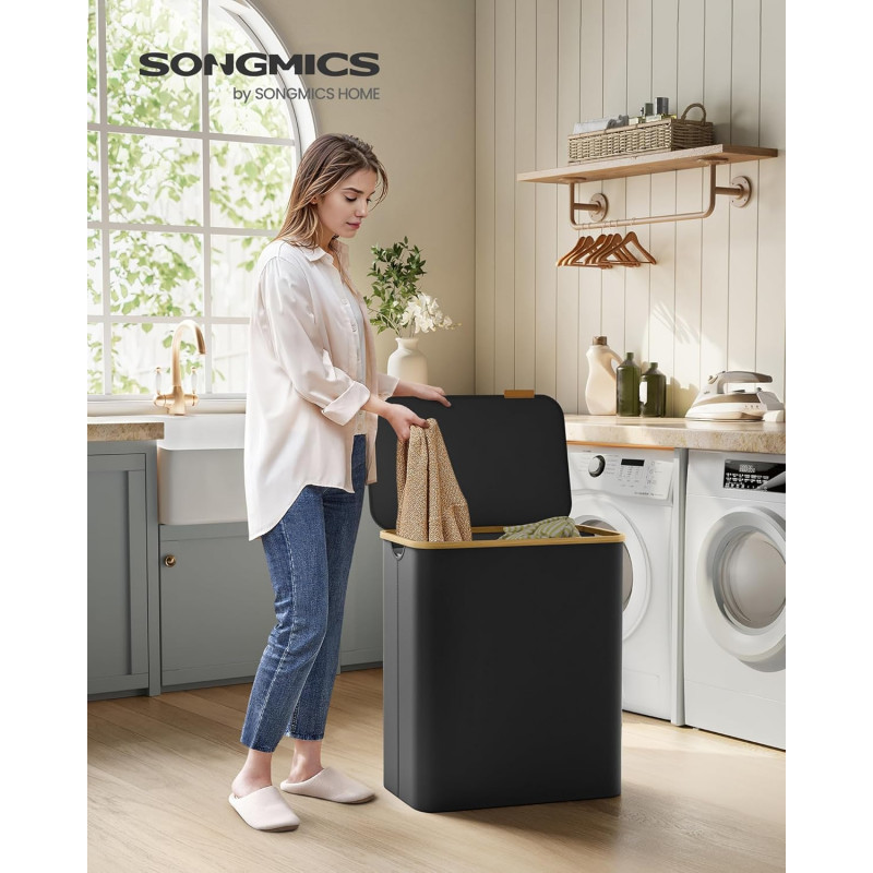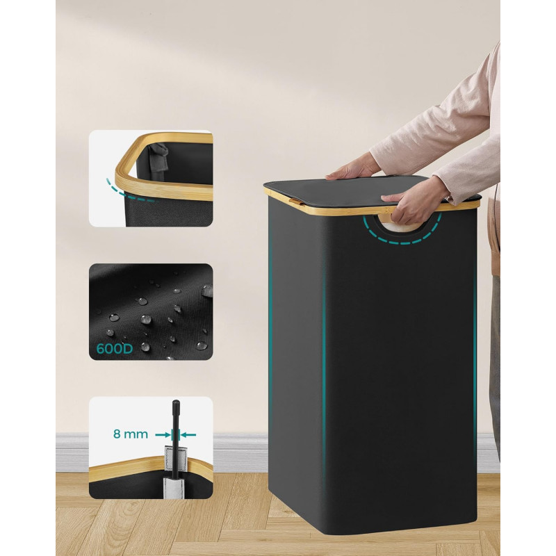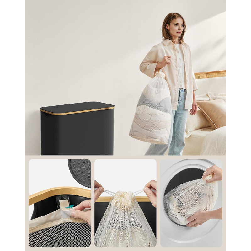 instructiuni Note VASAGLE: - Nu este recomandat sa depozitati cosul de rufe intr-un mediu umed pentru o perioada lunga de timp pentru a evita deteriorarea.- Evitati plasarea obiectelor grele pe capac pentru a evita deteriorarea.- Nu depozitati obiecte ascutite in acest cos de rufe pentru a evita orice deteriorare sau ranire. 3 compartimente spatioase Acest cos de rufe de 150 L cu dimensiuni de 60 x 38,5 x 70,5 cm si 3 compartimente este perfect pentru sortarea rufelor intr-o gospodarie cu mai multe persoane si simplificarea rutinei de spalare. Capac practic cu maner Capacul impiedica patrunderea prafului si va protejeaza intimitatea. Logo-ul din piele artificiala de pe capac serveste drept maner pentru o deschidere usoara si adauga o nota de eleganta Saci detasabili si versatili Sacii fixati de inchizatori Velcro sunt usor de indepartat. Corzile servesc drept manere pentru un transport usor. Datorita designului lor din plasa, acestea sunt, de asemenea, potrivite ca saci de rufe pentru rufe sortate la masina Durabil si robust Cosul de rufe este fabricat din tesatura Oxford 600 D ingrosata, hidrofuga, rezistenta la rupere si usor de curatat. Structura sa interna este sustinuta de tije din fibra de sticla pentru o mai mare stabilitate Asamblare usoara