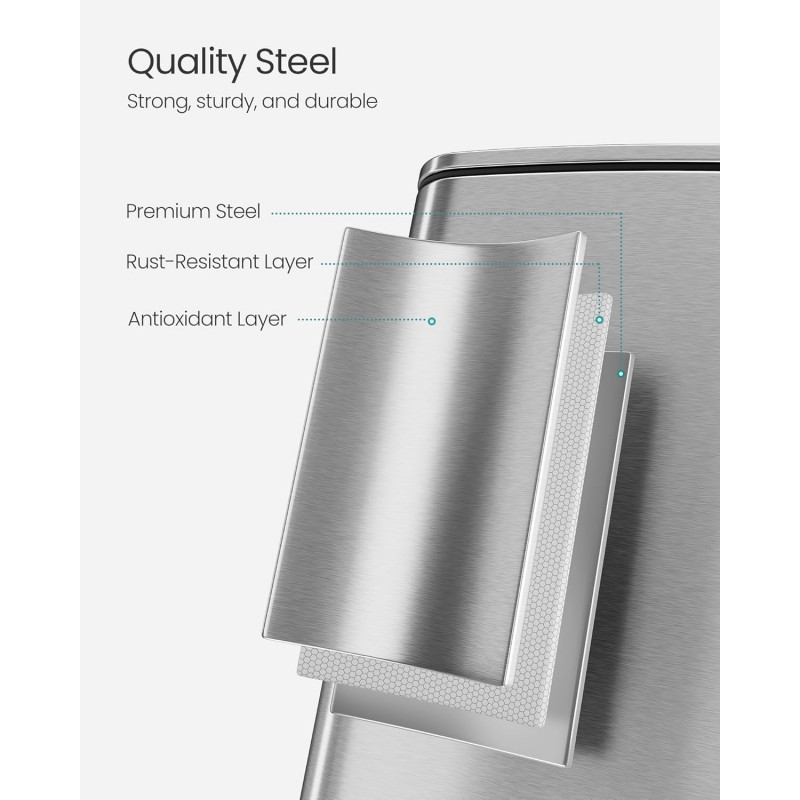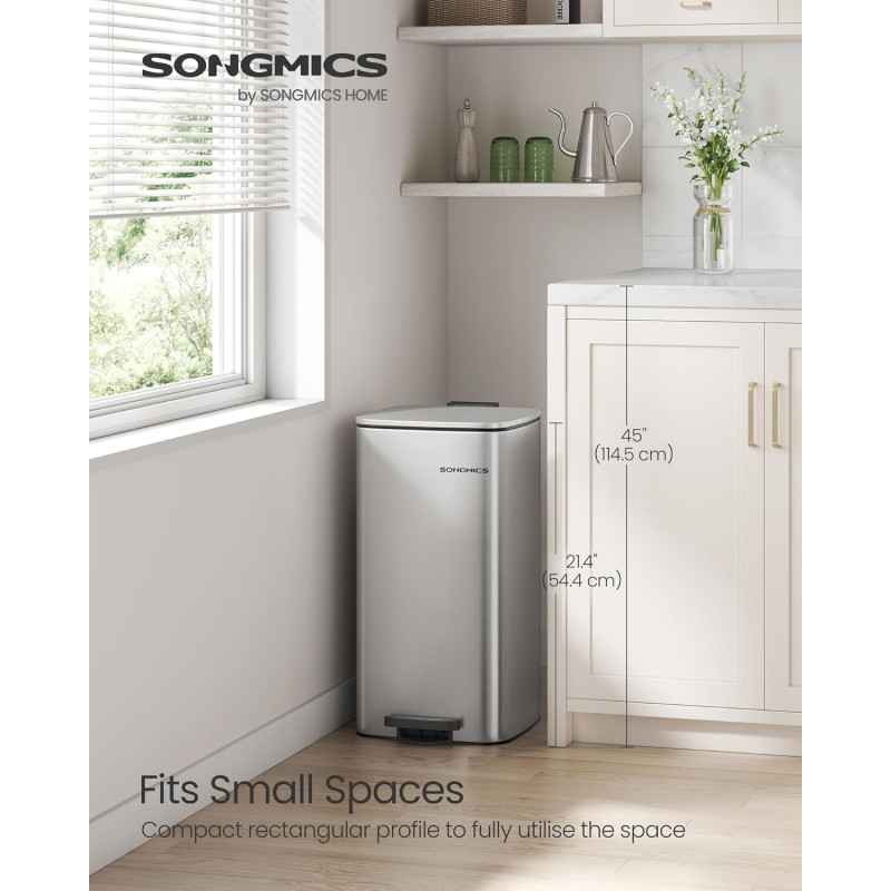 Scurta descriere: Cosul de gunoi SONGMICS de 30 L este o alegere practica si eleganta pentru orice bucatarie. Designul compact si modern permite economisirea spatiului, iar constructia din inox ofera durabilitate si un aspect premium. Sistemul de inchidere lenta si deschiderea cu pedala asigura confort si igiena in utilizarea zilnica.