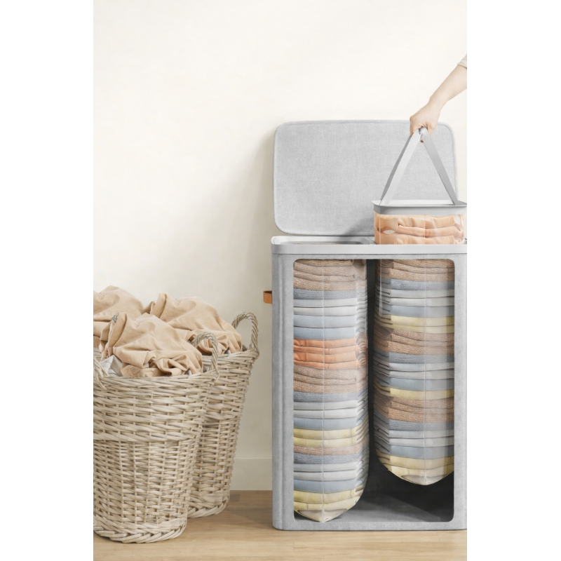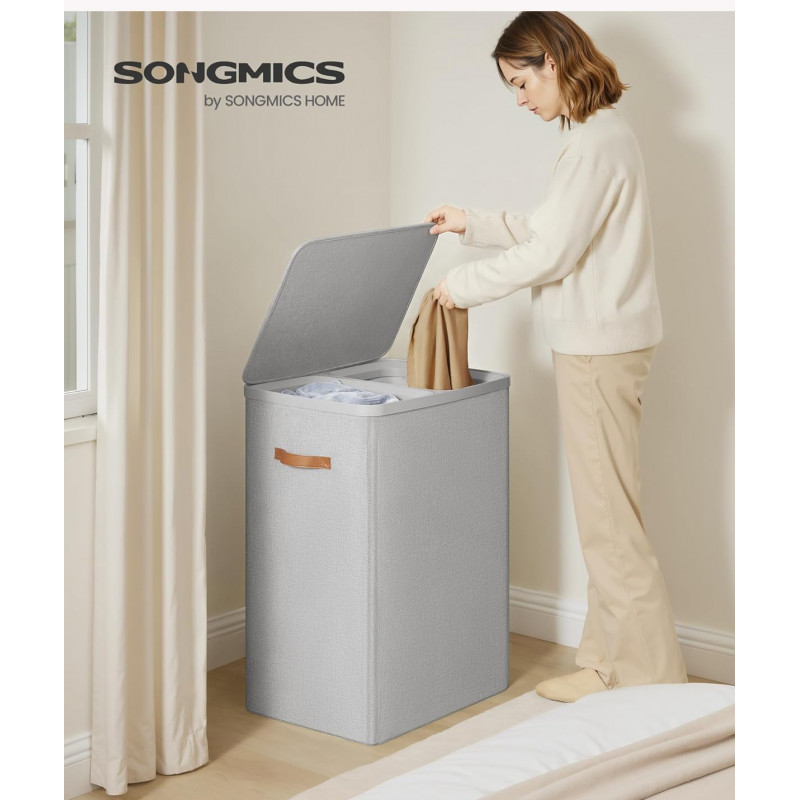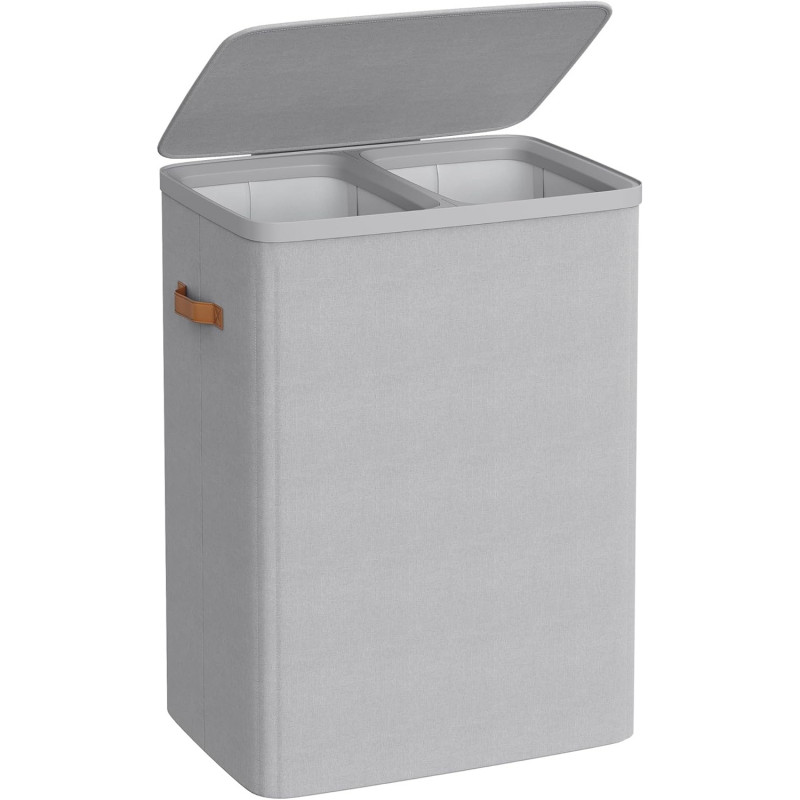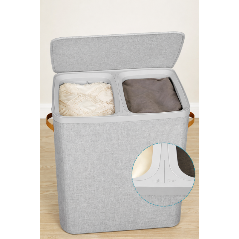 Scurta descriere Cosul de rufe cu 2 compartimente este ideal pentru sortarea eficienta a hainelor deschise si inchise la culoare. Capacitatea de 170 L ofera suficient spatiu pentru rufele unei familii pe parcursul unei saptamani. Structura usoara si montajul rapid il fac usor de instalat si utilizat. Sacii interiori cu manere permit transportul facil al rufelor pana la masina de spalat.
