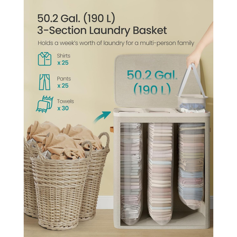 Scurta descriere: Cos de rufe extra spatios, cu o capacitate de 190 L, ideal pentru familii numeroase. Prevazut cu 3 compartimente pentru sortarea hainelor deschise, inchise si colorate. Realizat din poliester gros, rezistent la apa, cu design contemporan si capac pentru protectie si discretie.