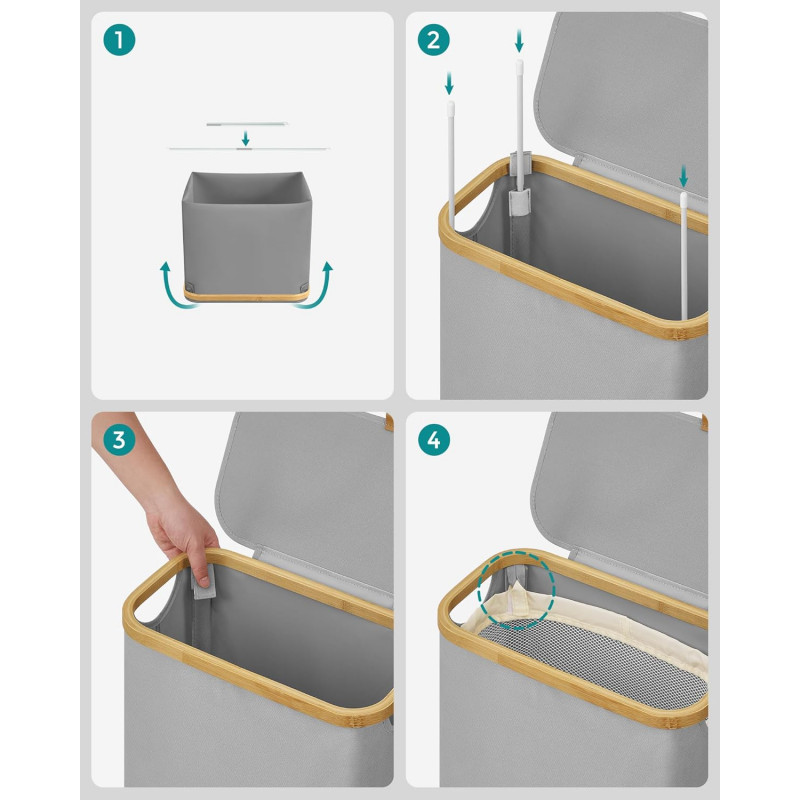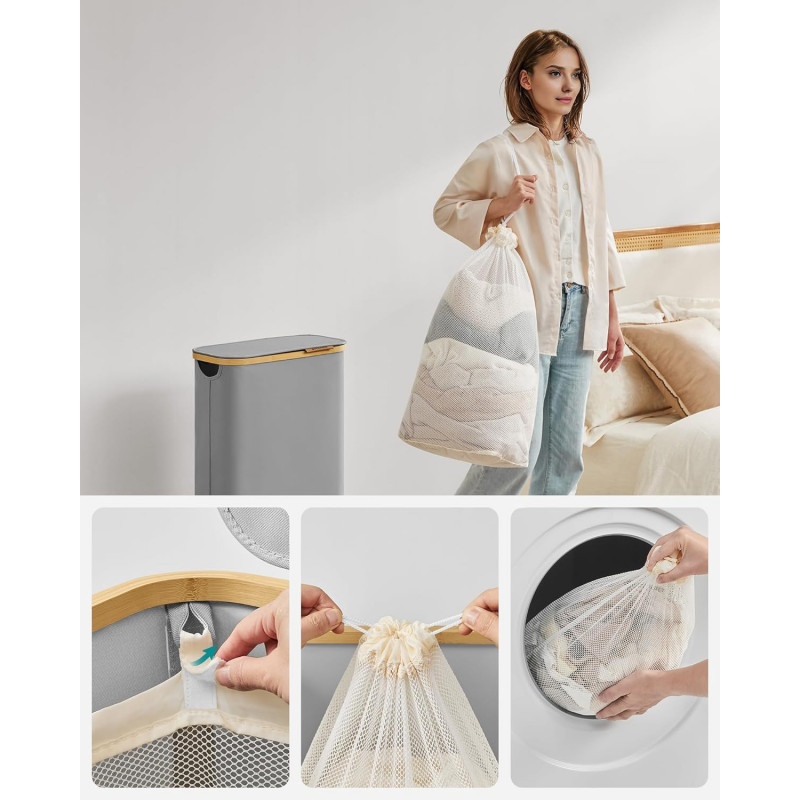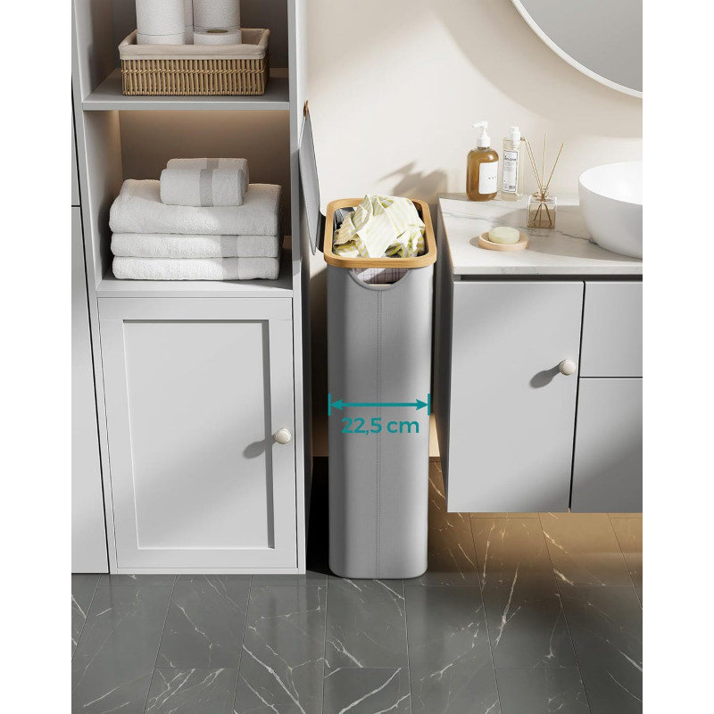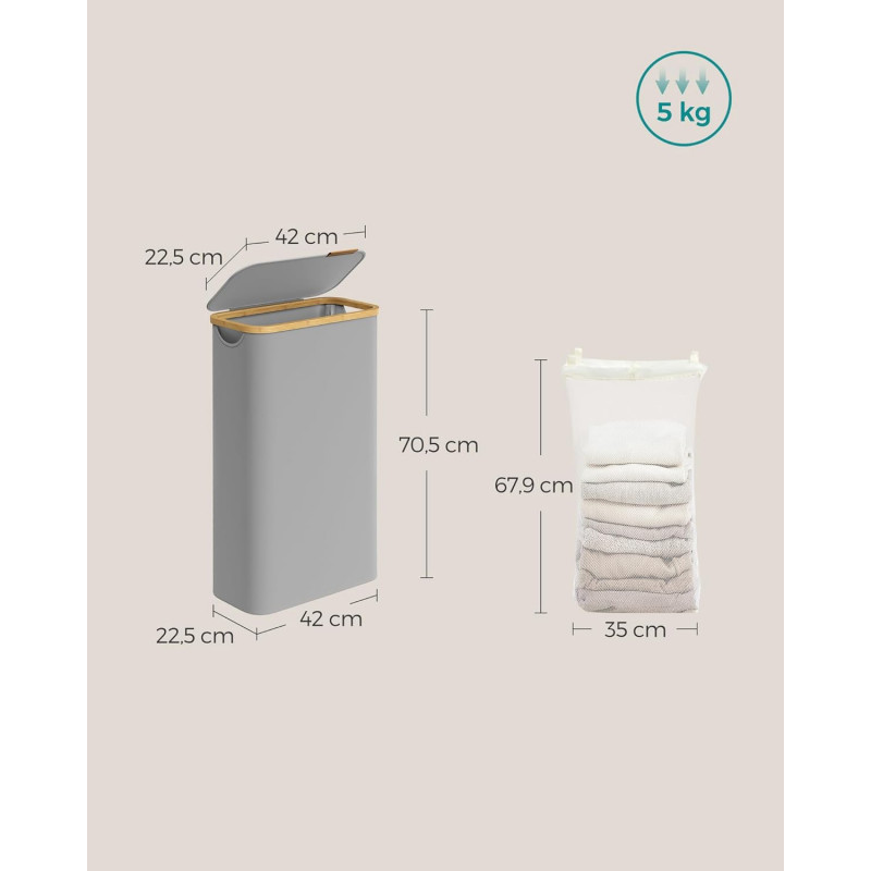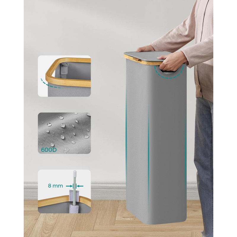 Scurta descriere Cosul de rufe SONGMICS este ideal pentru spatii inguste, oferind o solutie practica si eleganta pentru organizarea hainelor murdare. Cu un design slim si capacitate generoasa de 65 L, se integreaza perfect in bai sau camere mici. Sacul interior detasabil si materialele rezistente il fac usor de utilizat zi de zi.