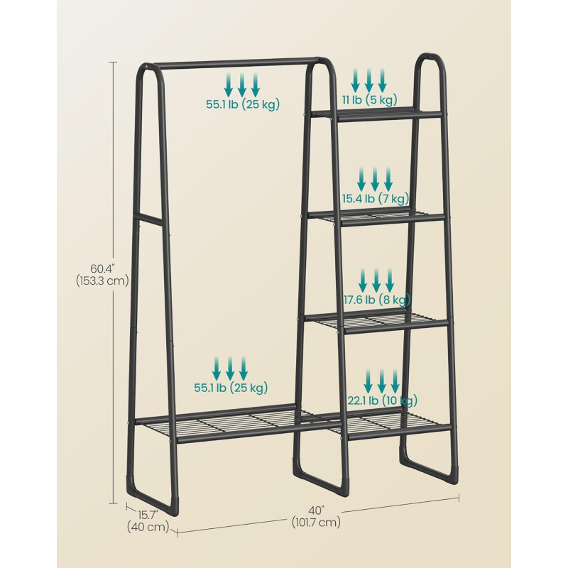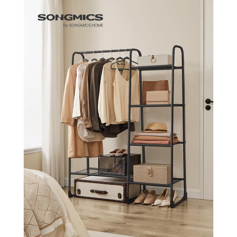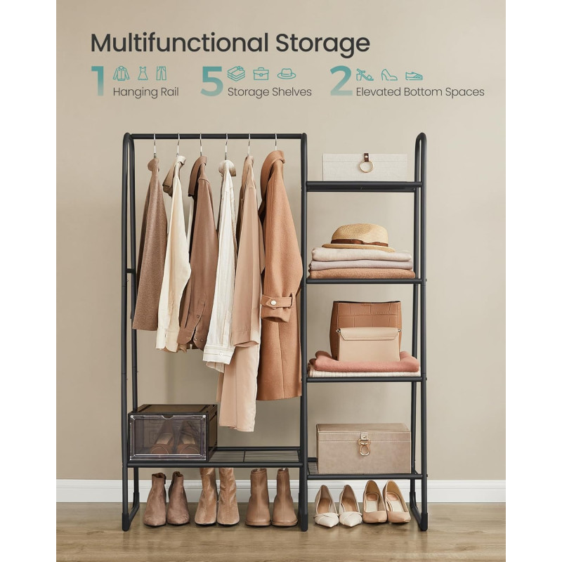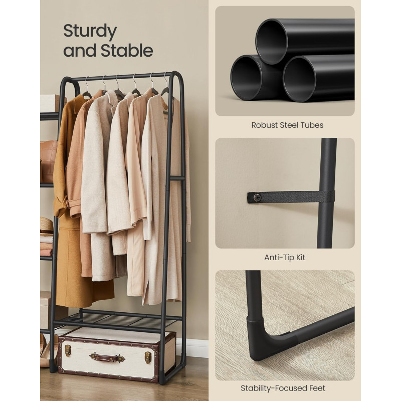 Scurta descriere: Organizeaza eficient hainele si accesoriile cu acest suport multifunctional, ideal pentru dormitor sau hol. Combina bara pentru umerase cu rafturi practice, oferind spatiu optim pentru depozitare.
