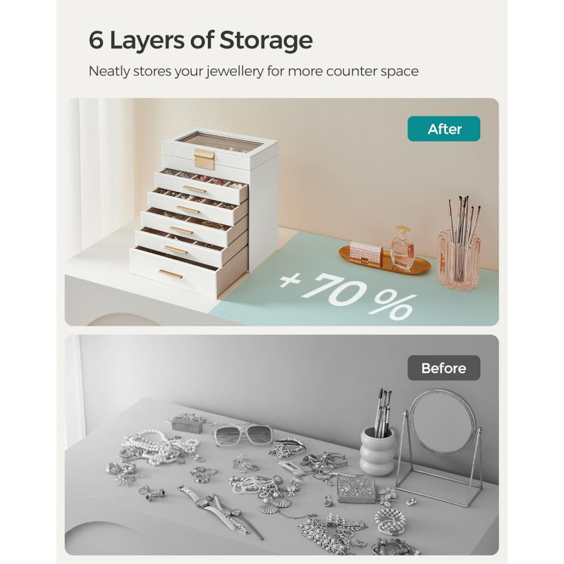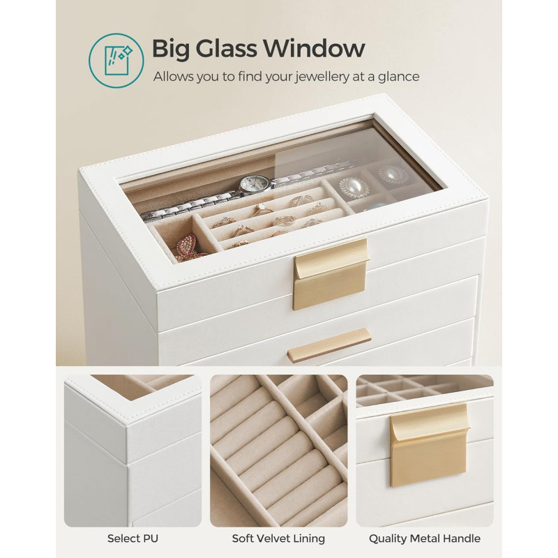 Scurta descriere Cutie pentru bijuterii cu 6 niveluri si capac transparent din sticla, ideala pentru organizarea eficienta a cerceilor, inelelor, colierelor si bratarilor. Design elegant in alb cu accente aurii, potrivit pentru dormitor sau dressing.