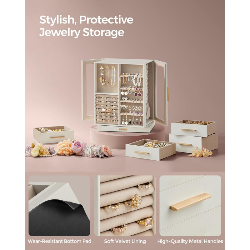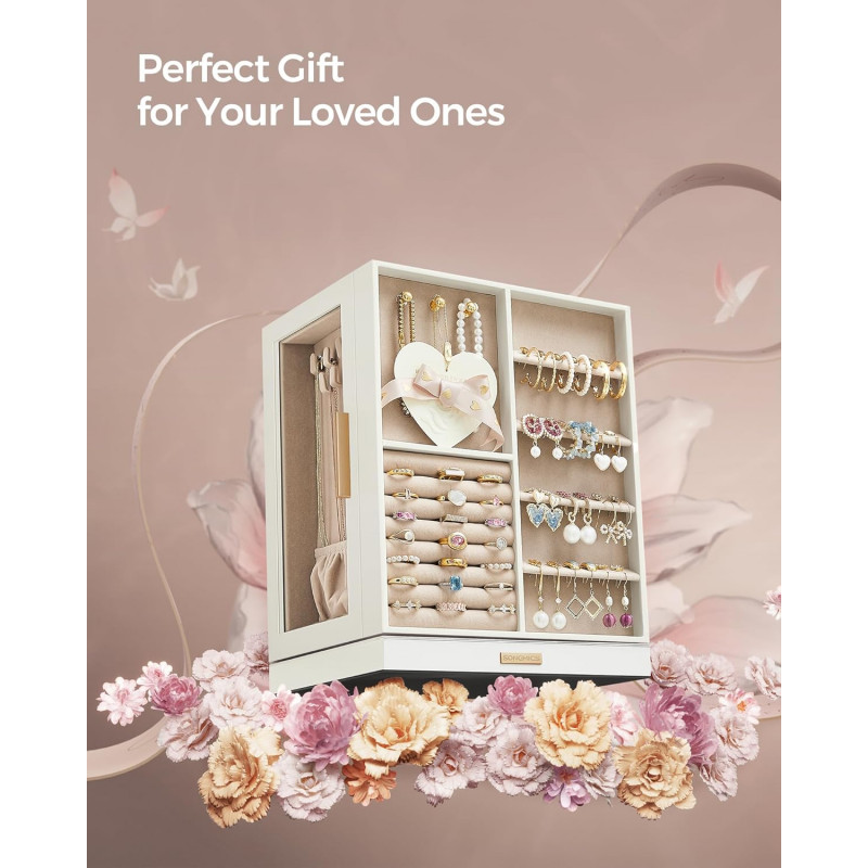 Scurta descriere: Cutia de bijuterii SONGMICS cu design rotativ 360° combina eleganta cu functionalitatea. Ofera depozitare verticala eficienta, ferestre laterale pentru acces rapid si 5 sertare bine compartimentate. Ideala pentru organizarea colierelor, inelelor si altor accesorii, este un cadou inspirat pentru orice ocazie.