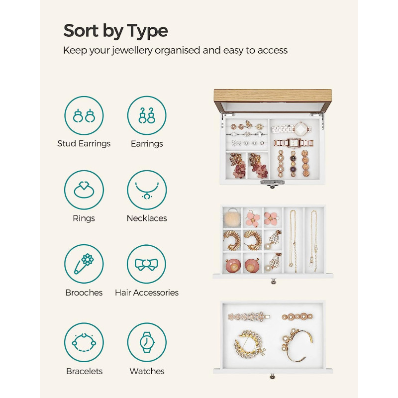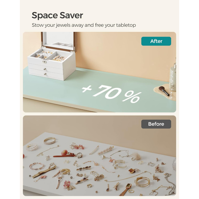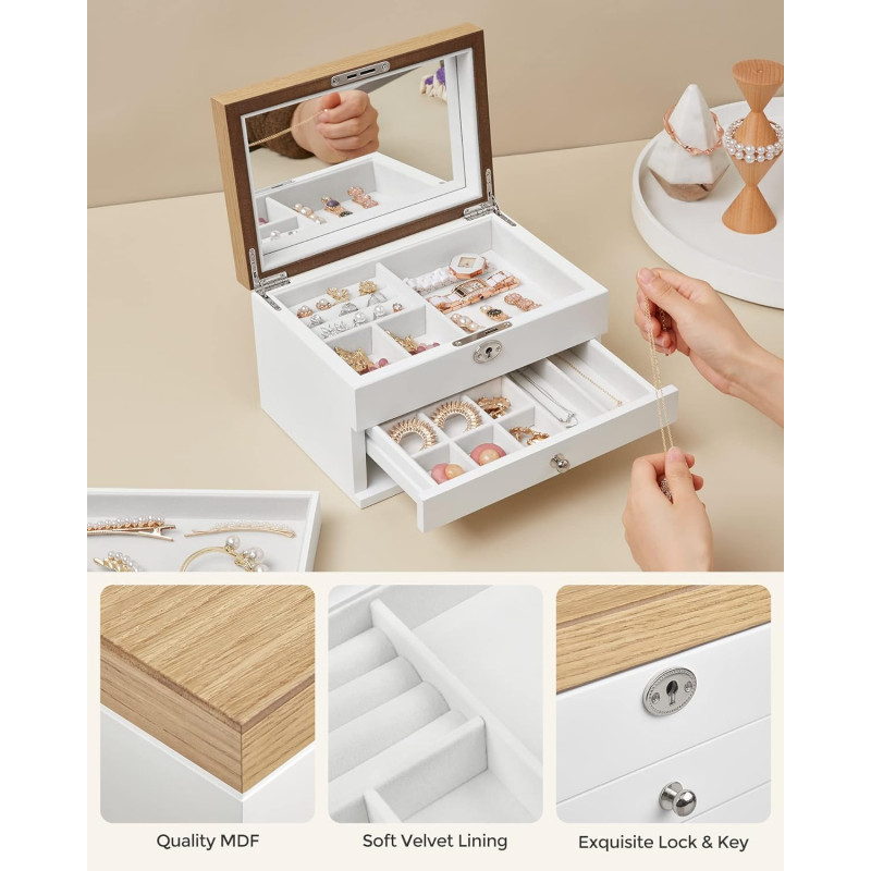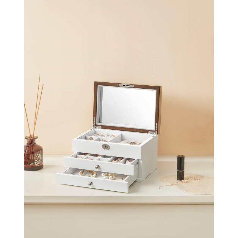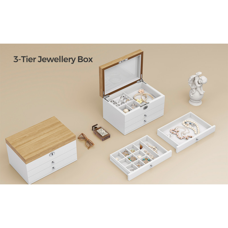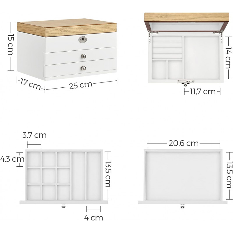 Greutate: 2 kg Va prezentam o cutie pentru depozitarea bijuteriilor cu 3 niveluri, o solutie ideala pentru persoanele care apreciaza stilul elegant. Albul elegant, combinat cu granulatia lemnului de pe capac, confera acestei cutii un aspect proaspat si rafinat. In interior exista trei niveluri cu sectiuni separate, oferind spatiu adecvat pentru inele, cercei, bratari si coliere, fiecare intr-un compartiment separat de diferite dimensiuni. Cutia are o oglinda mare in interiorul capacului, care va permite sa verificati rapid daca bijuteriile selectate se potrivesc stilului dumneavoastra. Fabricat din materiale de inalta calitate, cum ar fi MDF si captuseala moale din catifea, ofera o protectie completa pentru bijuteriile dvs. impotriva deteriorarilor si zgarieturilor. Aceasta cutie de bijuterii eleganta si practica este o idee grozava de cadou pentru prieteni, familie sau pentru tine.