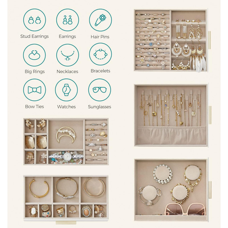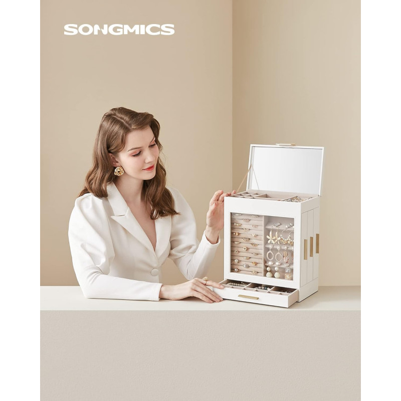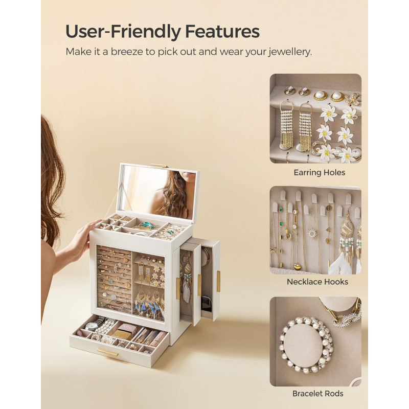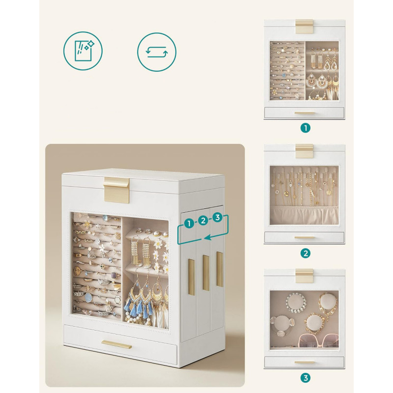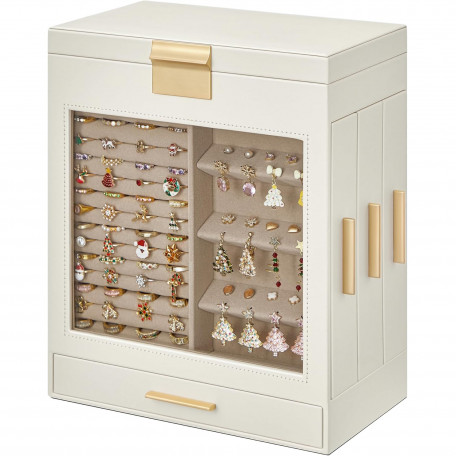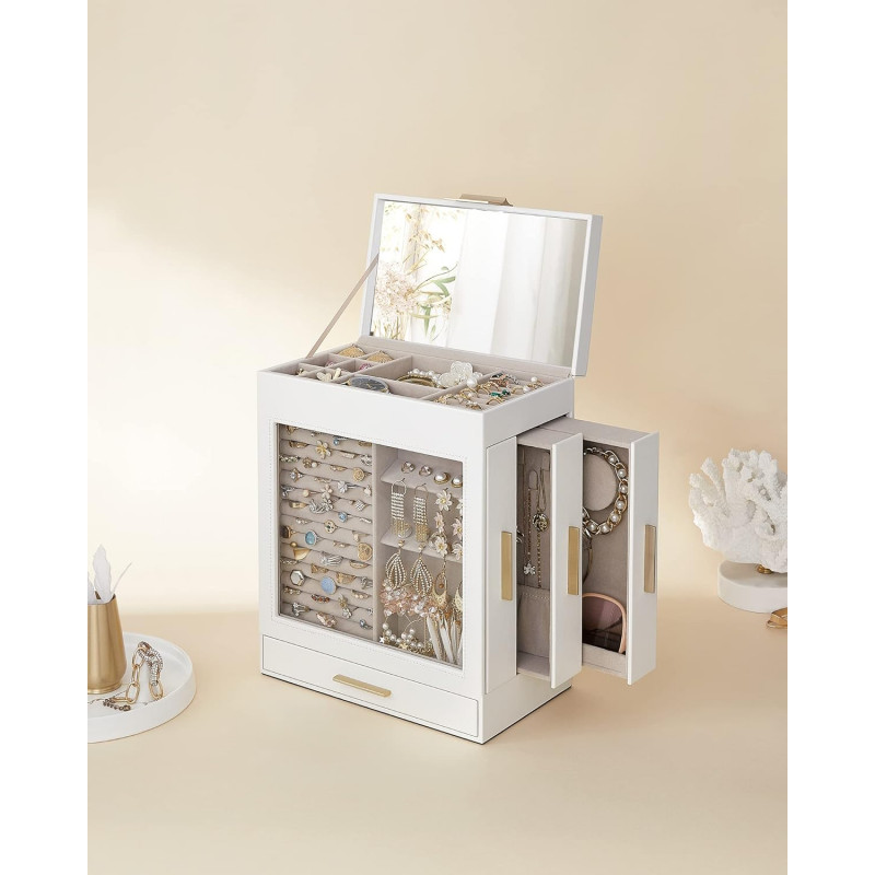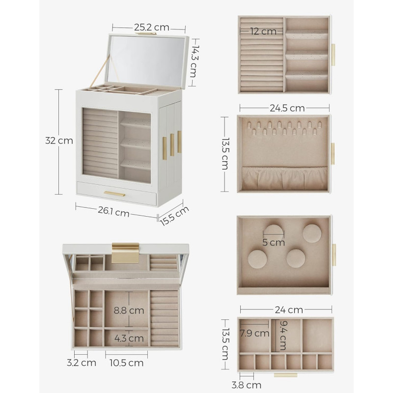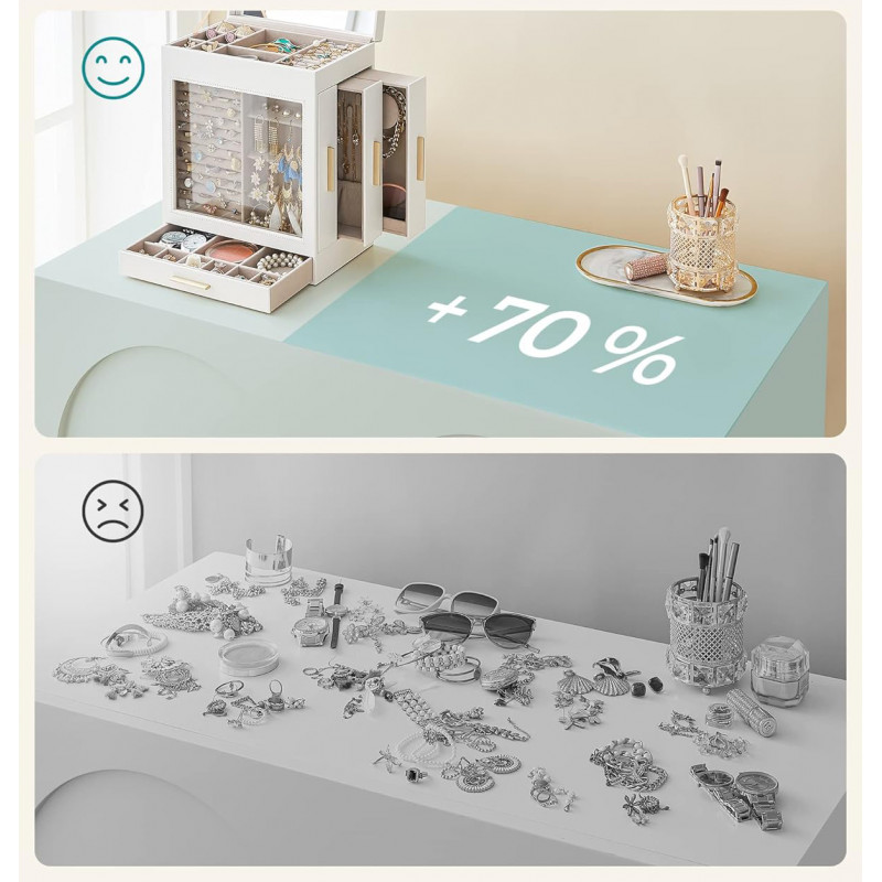 Dimensiunea produsului: 15,5 x 26,1 x 32 cm (D x W x H) Despre acest articol Pozitia celor 3 sertare laterale poate fi schimbata pentru a va permite sa aveti expuse bijuterii diferite, dupa cum doriti. Iar obiectele dvs. de valoare sunt pastrate fara praf in spatele ferestrei din sticla transparenta a acestei cutii de bijuterii!3 sertare laterale pentru agatarea colierelor si cerceilor cu pandantiv pentru a evita incurcarea si pentru depozitarea inelelor, cerceilor cu buton, bratarilor sau ceasurilor; tava superioara si sertarul inferior ofera spatiu de depozitare pentru brose, ace de par sau alte accesorii.Deschideti capacul organizatorului de bijuterii si veti gasi o oglinda mare care este la indemana pentru a va verifica bijuteriile si aspectul inainte de a iesi din casa, ajutandu-va sa incepeti ziua cu un aspect plin de farmec!Culori elegante alb si auriu, manere metalice lucioase, captuseala moale de catifea, cusaturi ingrijite, PU de calitate si MDF solid - toate aceste elemente combinate fac ca aceasta cutie pentru bijuterii sa fie eleganta si suficient de durabila pentru colectia ta de bijuterii in continua crestere.