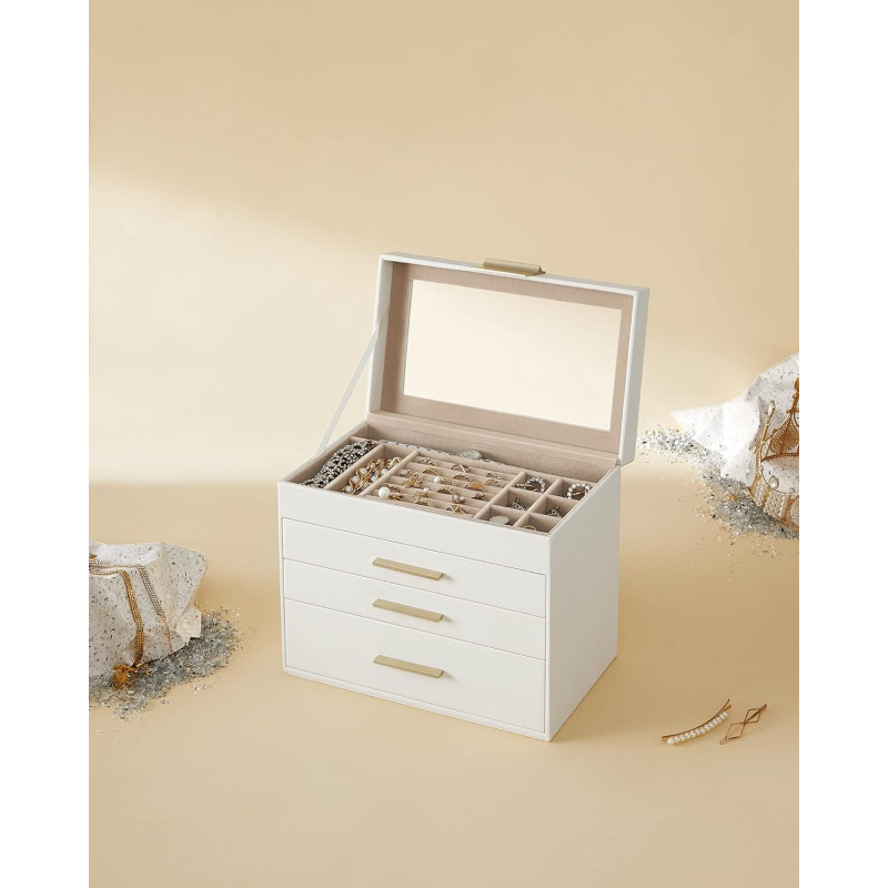 Greutatea produsului: 1,7 kg Despre acest articol Cele 3 niveluri superioare ale acestei cutii de bijuterii sunt prevazute cu compartimente de mai multe dimensiuni, astfel incat sa va puteti sorta bijuteriile mici in spatii separate. Ochelari de soare si ceasuri mari? Sunt bineveniti in sertarul mare de jos!Capacul din sticla transparenta va protejeaza bijuteriile dragi de praf si le pune si in evidenta. Deoarece este transparent, inseamna, de asemenea, ca puteti gasi piesele potrivite dintr-o privire.Culori elegante alb si auriu, manere metalice stralucitoare, captuseala moale de catifea, cusaturi ingrijite, PU de calitate si MDF solid - toate aceste elemente combinate fac ca acest organizator de bijuterii sa fie suficient de elegant si durabil pentru colectia dvs. de bijuterii in continua crestere.Idee perfecta de cadou: Oferiti aceasta trusa de bijuterii cu design original celor dragi de ziua lor de nastere sau de aniversare pentru a-i surprinde! Sau, rasfatati-va cu aceasta cutie de bijuterii de lux - o meritati!