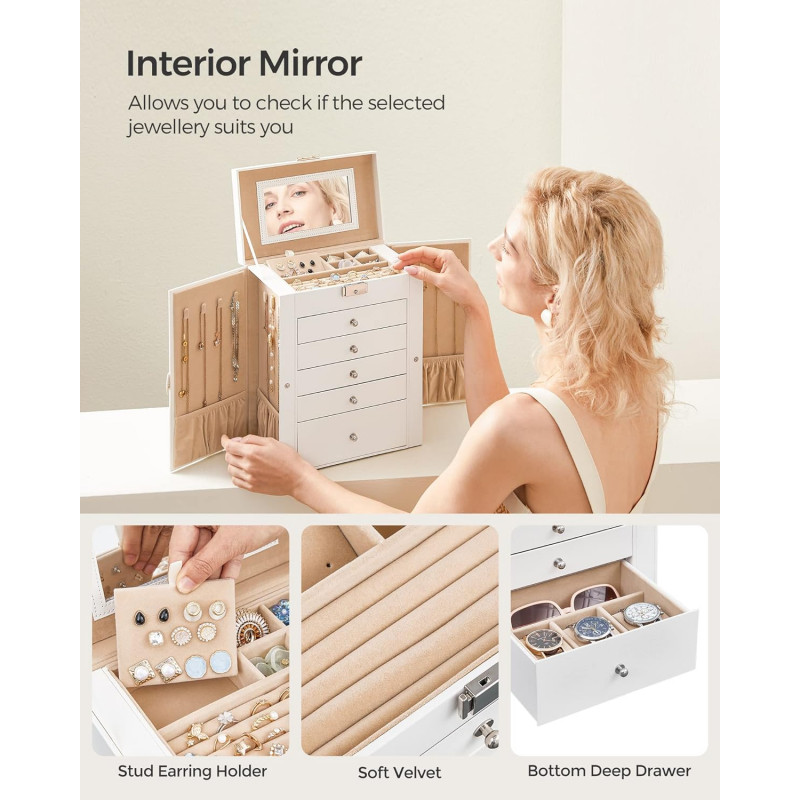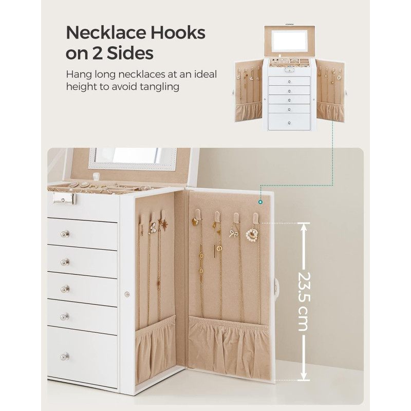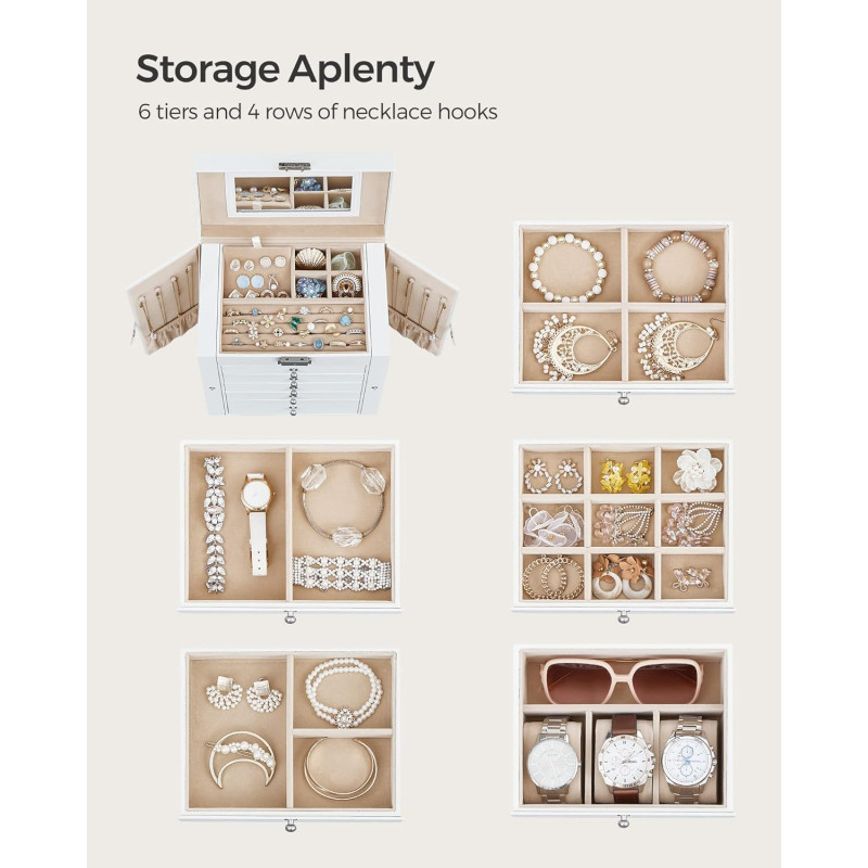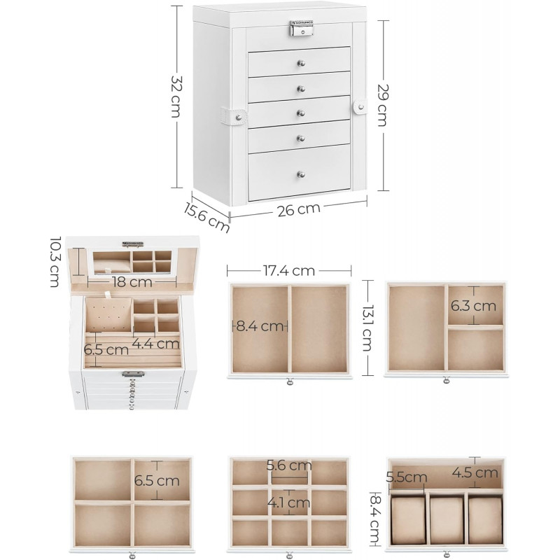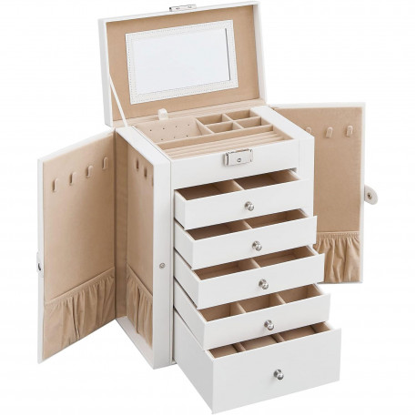 Caracteristica speciala: solida 6x niveluri, spatioase: Aceasta cutie de bijuterii cu 6 niveluri are mai multe straturi cu diferite compartimente si aranjamente pentru a va pastra toate bijuteriile, cum ar fi cercei si inele, sortate si organizate; sertarul inferior adanc se potriveste cu 3 ceasuri si o pereche de ochelari de soare. 4x randuri de carlige pentru coliere: 4 randuri de carlige la o inaltime ideala perfect colierele dvs., chiar si pentru cele mai lungi, fara a va face griji cu privire la descalcirea acestor coliere data viitoare cand doriti sa le purtati.