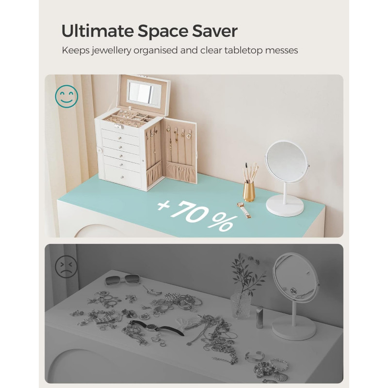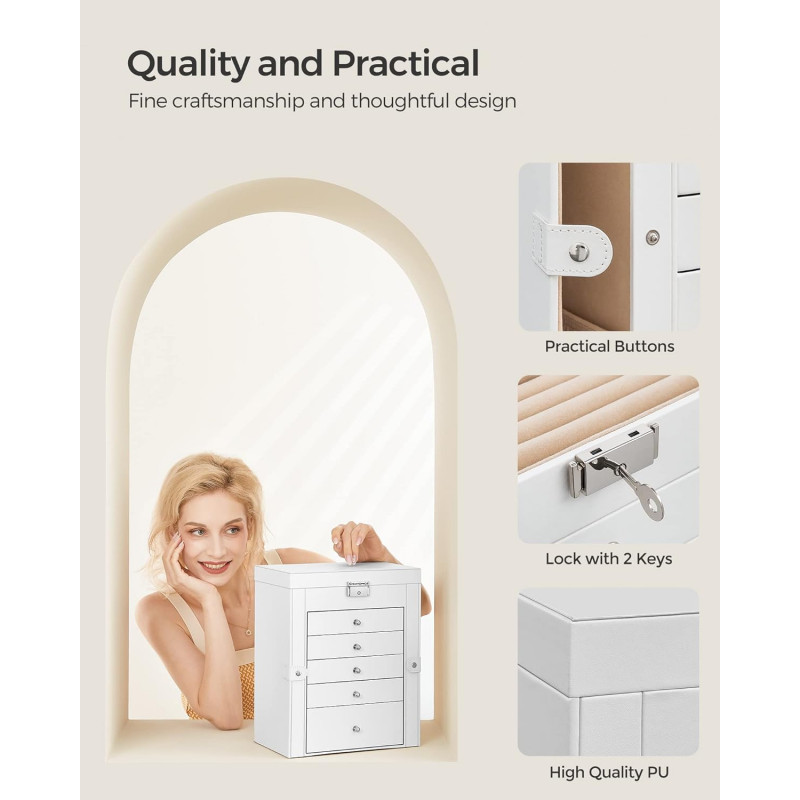 Cu oglinda interioara si incuietoare: Suportul pentru bijuterii are o oglinda in interior care va permite sa va machiati si sa va verificati cu usurinta aspectul, economisind timp pretios de dimineata; are o incuietoare cu 2 chei pentru a va tine obiectele de valoare departe de copiii obraznici.