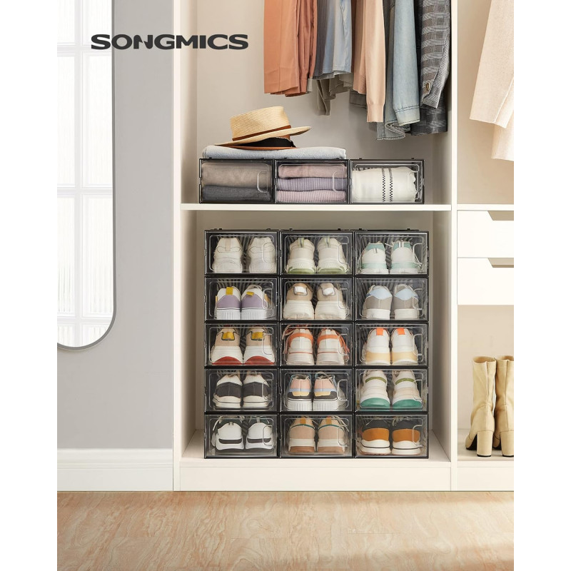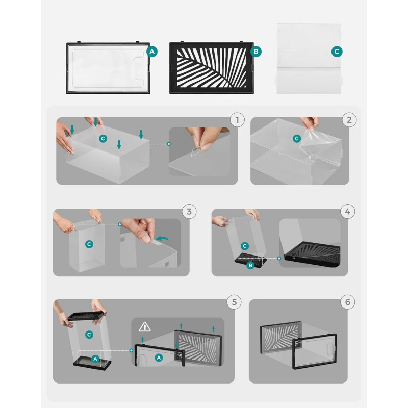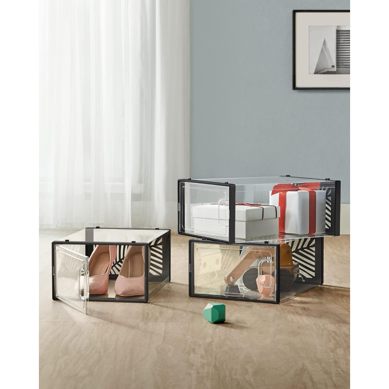 Dimensiune interioara per cutie de pantofi: 30 x 22,6 x 13,5 cm (D x W x H) Acest set de 18 cutii modulare pentru depozitarea pantofilor este o solutie practica si eficienta pentru a organiza si depozita pantofii intr-un mod ordonat si protejat. Aceste cutii modulare sunt concepute special pentru a oferi o solutie de depozitare pentru pantofii tai.Daca vrei sa depozitezi cutiile intr-un mod organizat, design-ul corespunzator face stivuirea lor o joaca de copii; orificiile de ventilatie permit pantofilor tai sa respire. Panoul din spate al organizatorului de pantofi este echipat cu gauri in forma de frunze care nu numai ca ofera organizatorului un stil modern, dar permit si o buna circulatie a aerului pentru a evita mirosurile neplacute.18 cutii din plastic usor de emblemat, fiecare cu o dimensiune interioara de 30 x 22,6 x 13,5 cm pentru pantofi de pana la marimea 44 si va ajuta sa eliminati haosul in cel mai scurt timp!
