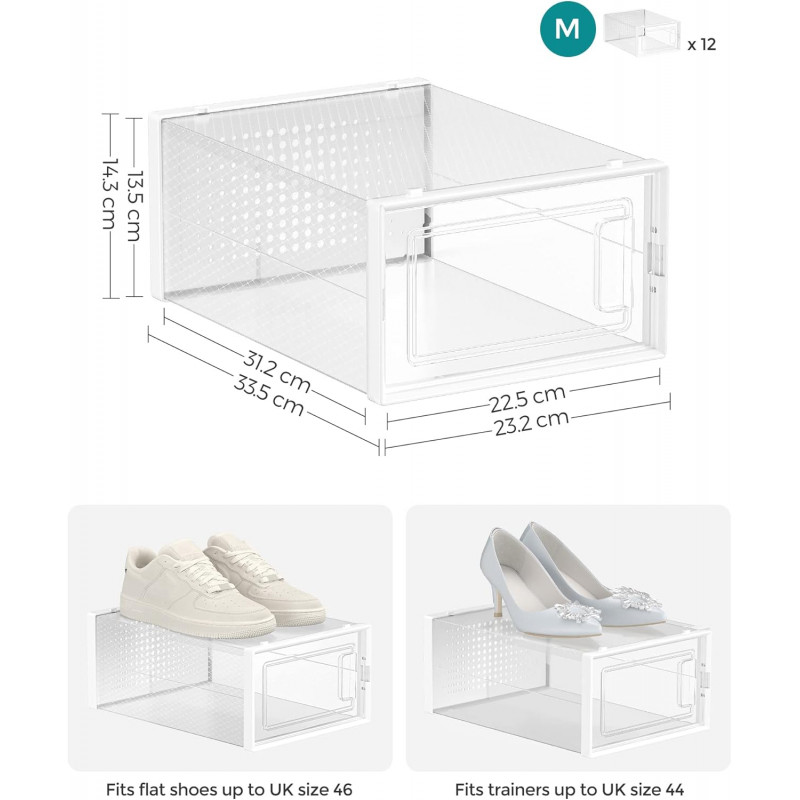 Dimensiunile produsului: 33,5 L x 23,2 W x 14,3 H cm Despre acest articol Acest set de 12 cutii modulare pentru depozitarea pantofilor este o solutie practica si eficienta pentru a organiza si depozita pantofii intr-un mod ordonat si protejat. Aceste cutii modulare sunt concepute special pentru a oferi o solutie de depozitare pentru pantofii tai.Daca vrei sa depozitezi cutiile intr-un mod organizat, design-ul corespunzator face stivuirea lor o joaca de copii; orificiile de ventilatie permit pantofilor tai sa respire. Pur si simplu strangeti fata, spatele si corpul impreuna si veti avea aceste organizatoare de pantofi cu o dimensiune interioara de 33,5x 23,2 x 14,3 cm.