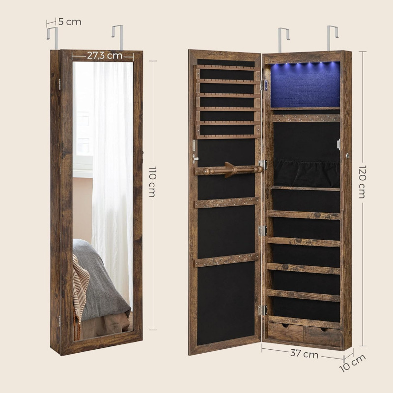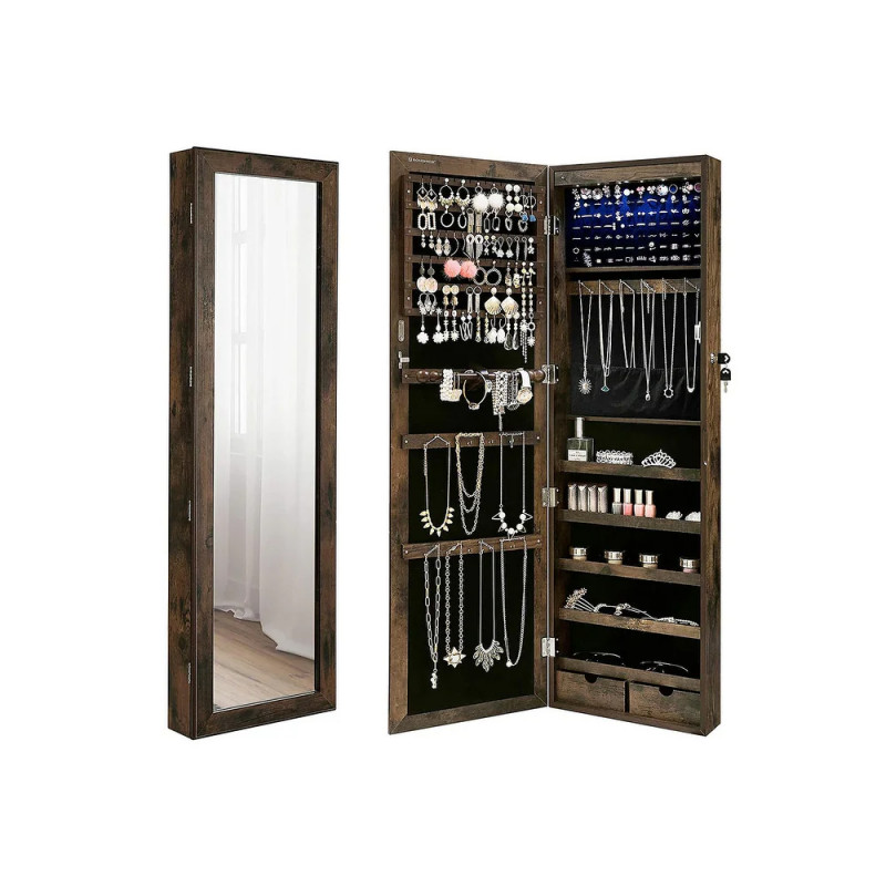 Va rugam sa nu il asezati in zone umede pentru a evita deformarea. Despre acest articol Renuntati la zilele in care bijuteriile dispareau si se incurcau si ridicati-va rutina zilnica de frumusete la nivelul urmator cu acest dulap de bijuterii chic cu oglinda din sticla, linii curate si un finisaj maro rustic.