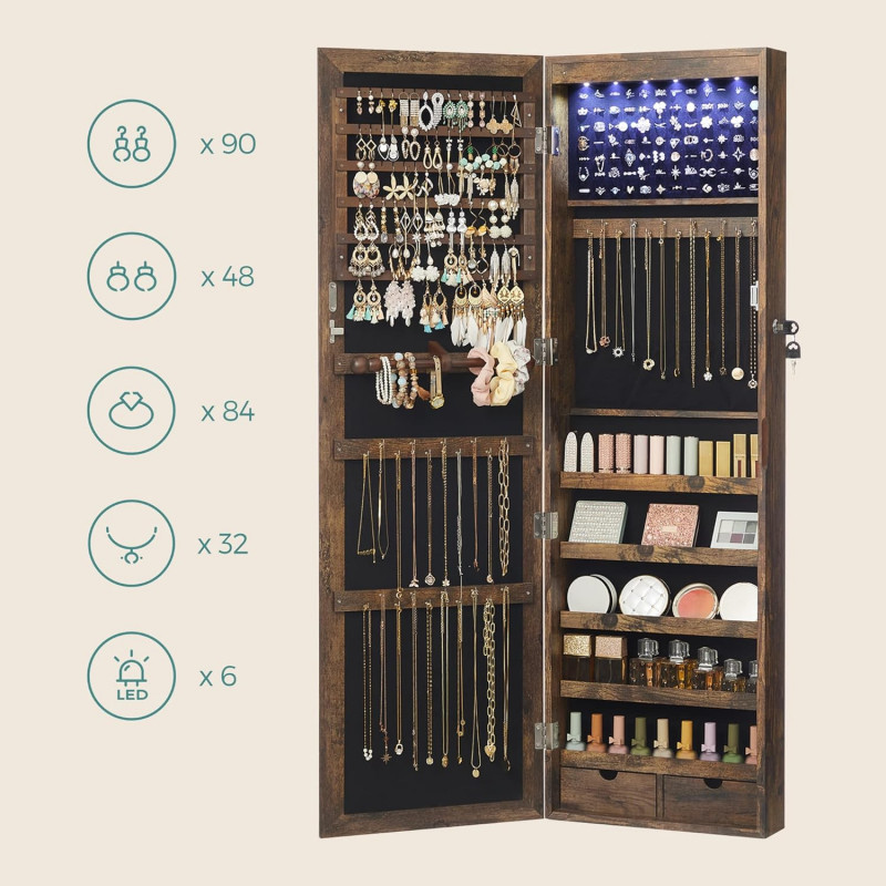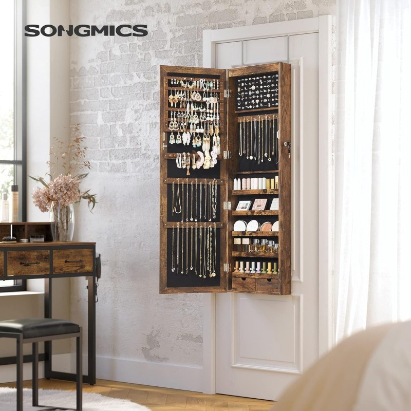 Umpleti cu lucruri stralucitoare: La sfarsitul unei zile lungi, scoateti-va inelele, cerceii si colierele si puneti-le la loc in acest dulap pentru bijuterii - 84 de locuri pentru inele, 90 de locuri pentru cercei, 48 de gauri pentru cercei, 32 de carlige pentru coliere, 5 rafturi, 2 sertare si 1 tija pentru bratari, toate intr-un singur loc.Usa sau perete? Tu ai ultimul cuvant! Puteti plasa pur si simplu acest dulap de bijuterii suspendat pe rama usii folosind suporturile incluse sau il puteti fixa pe un perete solid folosind suruburile furnizate; veti economisi mai mult spatiu in ambele cazuri.