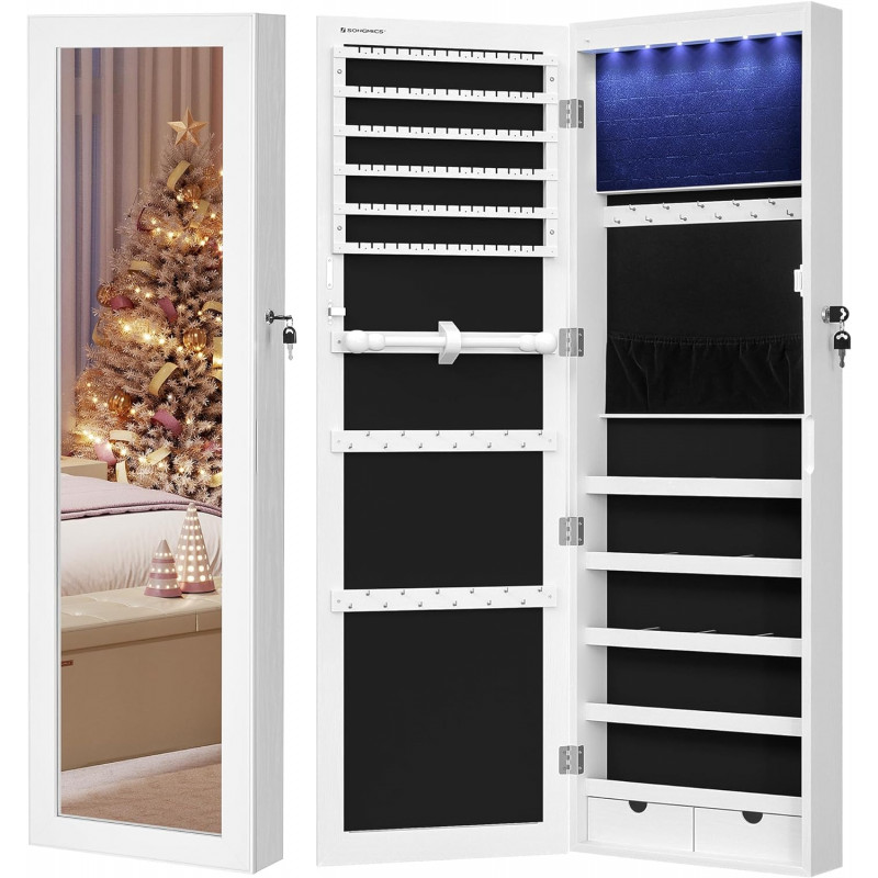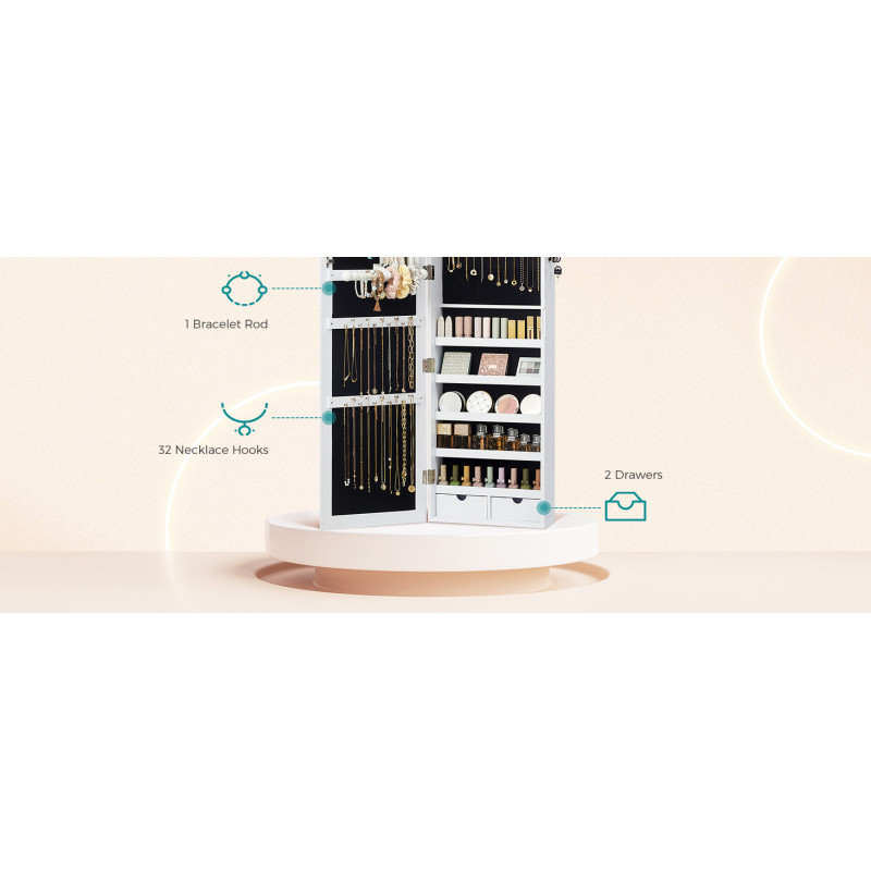 Greutate: 10kg Despre acest articol 84 de locuri pentru inele, 90 de fante pentru cercei, 48 de gauri pentru cercei, 32 de carlige pentru coliere, 5 rafturi, 2 sertare si 1 tija pentru bratari, toate intr-un singur loc.Puteti plasa pur si simplu acest dulap de bijuterii suspendat pe rama usii, folosind suporturile incluse, sau pur si simplu il puteti fixa pe un perete solid folosind suruburile furnizate; veti economisi mai mult spatiu in ambele cazuri.O structura simpla si o functionalitate ridicata se intalnesc pentru a crea acest dulap de bijuterii unic. Asadar, daruiti acest organizator de bijuterii celei mai dragi prietene sau, in schimb, tratati-va pe dumneavoastra - dati-i drumul, meritati!