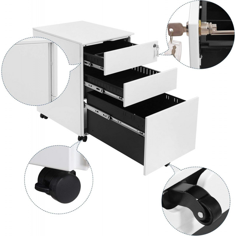 Scurta descriere Dulapiorul metalic de birou SONGMICS cu 3 sertare este solutia ideala pentru organizarea documentelor. Cu un design minimalist si modern, este echipat cu sistem de inchidere, organizator de sertar si bara pentru dosare suspendate. Construit din otel rezistent, suporta pana la 20 kg in sertarul inferior.