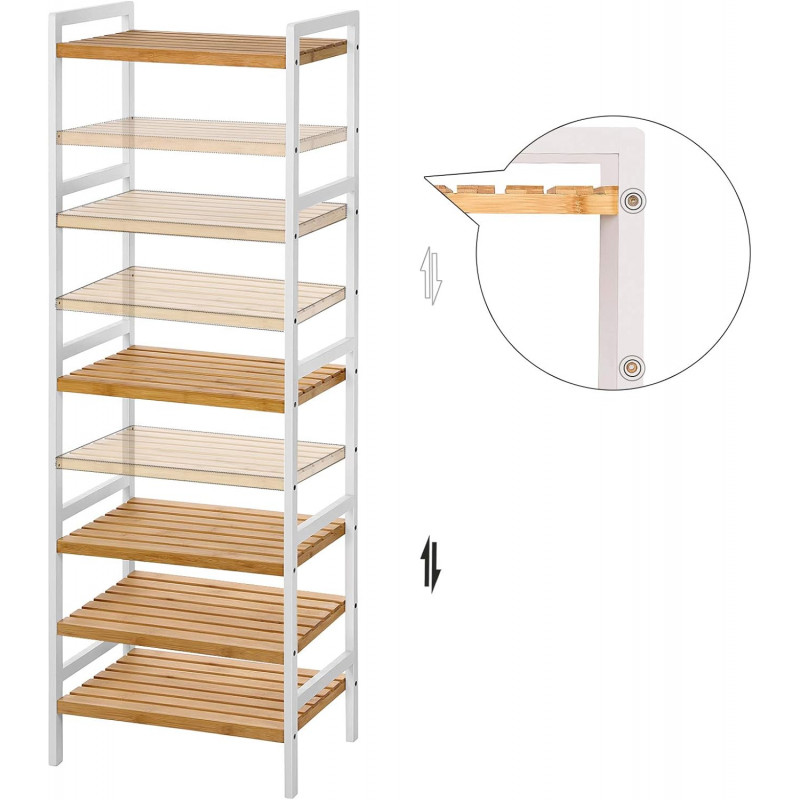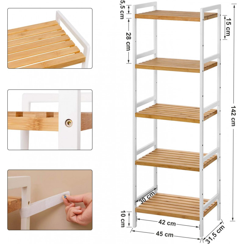 Scurta descriere Etajera din bambus cu 5 rafturi practice, potrivita pentru orice incapere din casa. Structura stabila sustine pana la 60 kg in total, fiind ideala pentru depozitarea ordonata a accesoriilor din baie, bucatarie, living sau dormitor. Design natural, usor de integrat in decoruri moderne sau clasice.