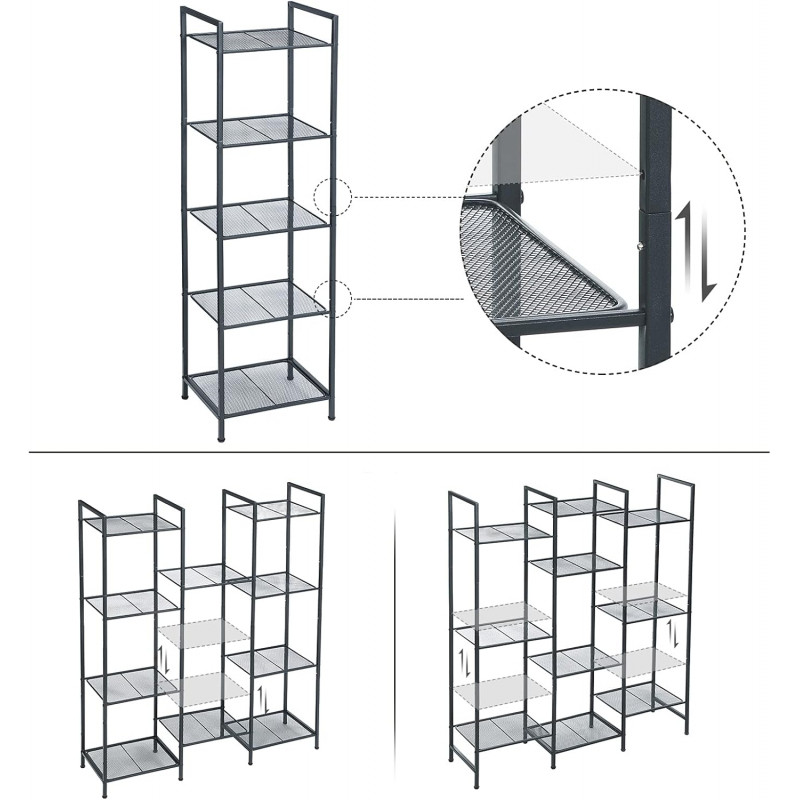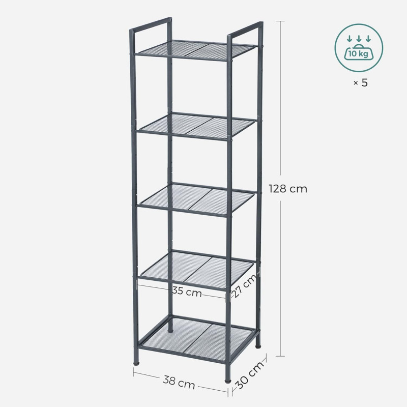 Scurta descriere Etajera SONGMICS cu 5 niveluri ofera spatiu generos pentru organizarea obiectelor in baie, bucatarie, balcon sau living. Structura metalica solida si rafturile ajustabile permit depozitarea diversificata, iar designul industrial in nuanta neagra aduce un plus de stil oricarui interior.