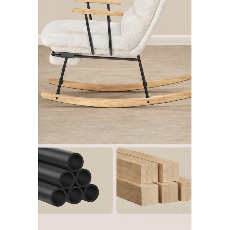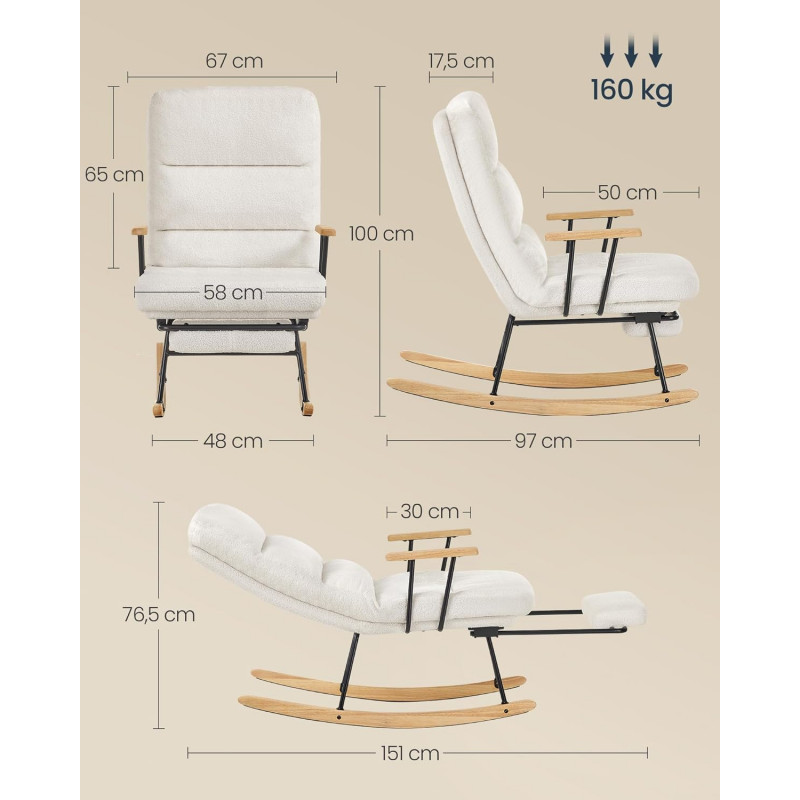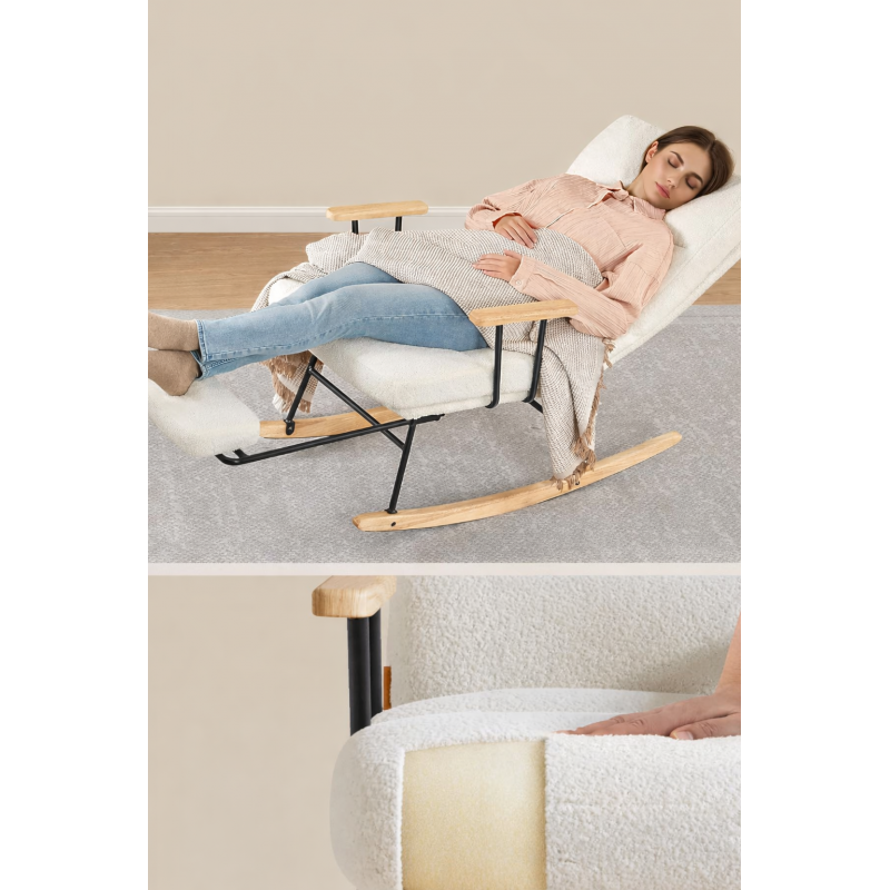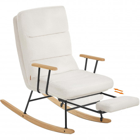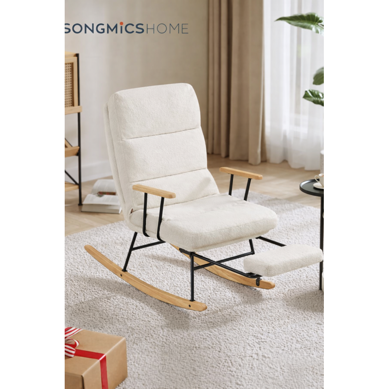 Scurta descriere SONGMICS HOME Fotoliu balansoar ofera confort si relaxare in orice moment al zilei. Spatarul reglabil in 4 pozitii si suportul de picioare extensibil permit ajustarea pozitiei ideale pentru citit, odihna sau relaxare. Tapiteria moale si designul elegant in nuanta crem se integreaza usor in living sau dormitor.